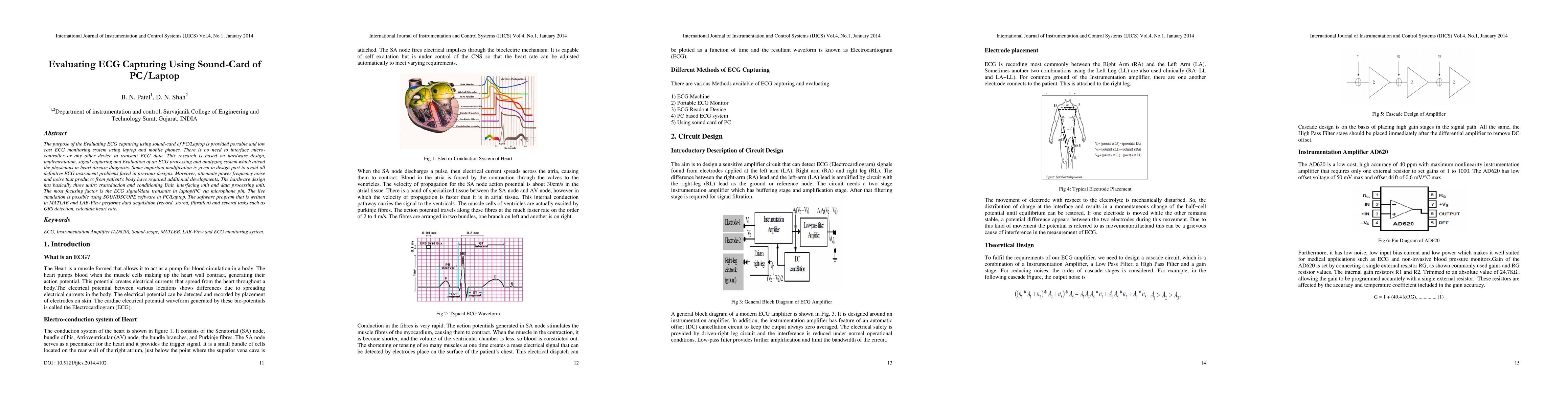 The purpose of the Evaluating ECG capturing using sound-card of PC/Laptop is provided portable and low cost ECG monitoring system using laptop and mobile phones. There is no need to interface micro controller or any other device to transmit ECG data. This research is based on hardware design, implementation, signal capturing and Evaluation of an ECG processing and analyzing system which attend the physicians in heart disease diagnosis. Some important modification is given in design part to avoid all definitive ECG instrument problems faced in previous designs. Moreover, attenuate power frequency noise and noise that produces from patient's body have required additional developments. The hardware design has basically three units: transduction and conditioning Unit, interfacing unit and data processing unit.The most focusing factor is the ECG signal/data transmits in laptop/PC via microphone pin. The live simulation is possible using SOUNDSCOPE software in PC/Laptop. The software program that is written in MATLAB and LAB-View performs data acquisition (record, stored, filtration) and several tasks such as QRS detection, calculate heart rate.