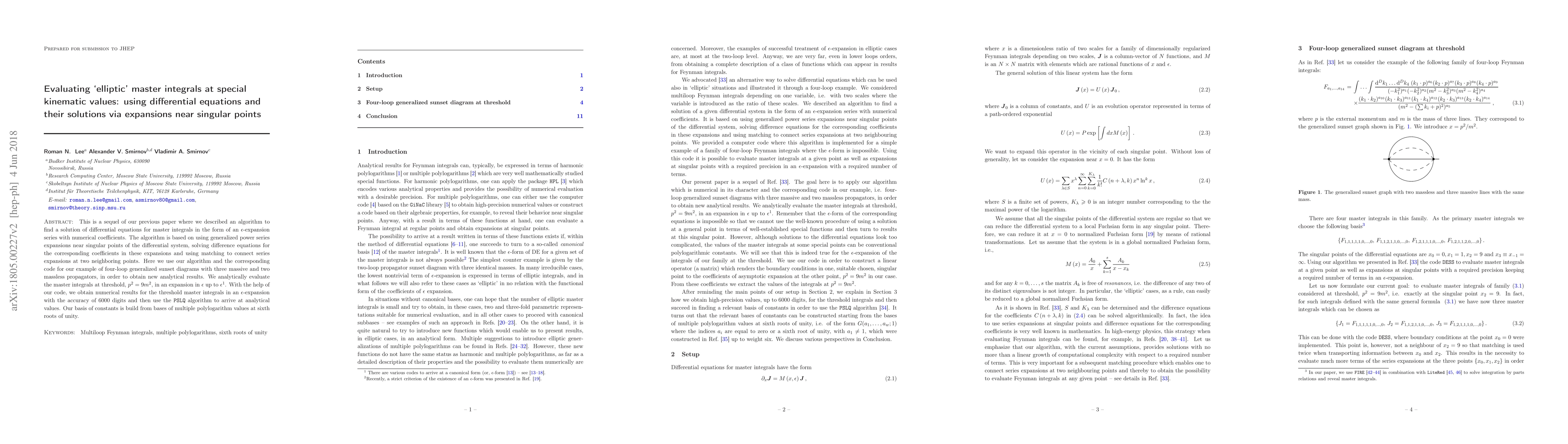 This paper extends an algorithm to solve differential equations for elliptic master integrals using $\epsilon$-expansions, applying it to four-loop generalized sunset diagrams to obtain analytical results at threshold values. The method achieves high-precision numerical results and derives analytical values using the PSLQ algorithm.
