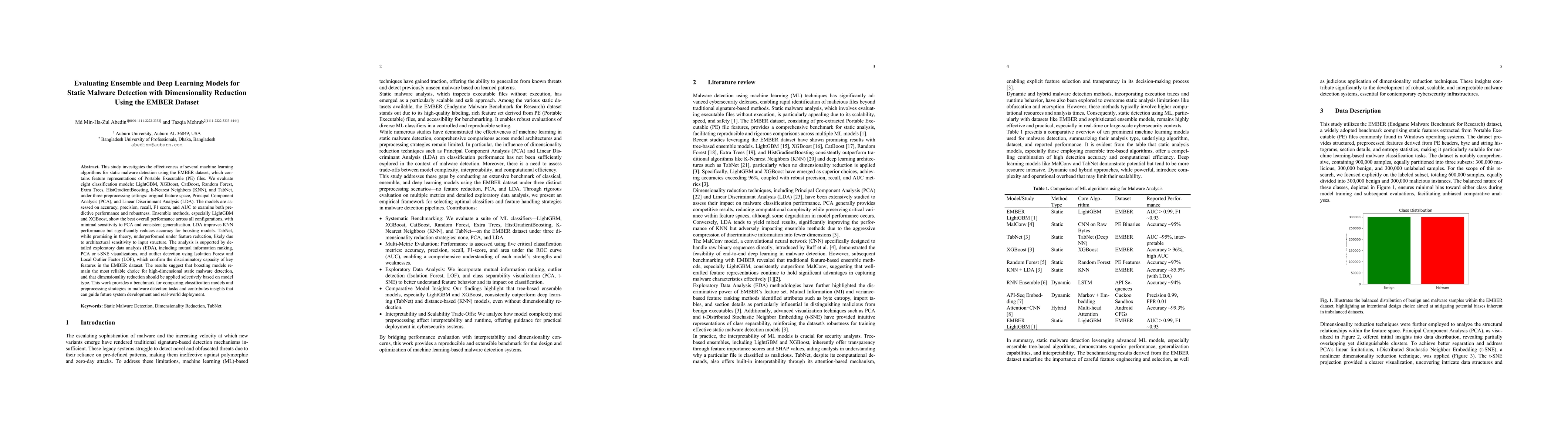 This study investigates the effectiveness of several machine learning algorithms for static malware detection using the EMBER dataset, which contains feature representations of Portable Executable (PE) files. We evaluate eight classification models: LightGBM, XGBoost, CatBoost, Random Forest, Extra Trees, HistGradientBoosting, k-Nearest Neighbors (KNN), and TabNet, under three preprocessing settings: original feature space, Principal Component Analysis (PCA), and Linear Discriminant Analysis (LDA). The models are assessed on accuracy, precision, recall, F1 score, and AUC to examine both predictive performance and robustness. Ensemble methods, especially LightGBM and XGBoost, show the best overall performance across all configurations, with minimal sensitivity to PCA and consistent generalization. LDA improves KNN performance but significantly reduces accuracy for boosting models. TabNet, while promising in theory, underperformed under feature reduction, likely due to architectural sensitivity to input structure. The analysis is supported by detailed exploratory data analysis (EDA), including mutual information ranking, PCA or t-SNE visualizations, and outlier detection using Isolation Forest and Local Outlier Factor (LOF), which confirm the discriminatory capacity of key features in the EMBER dataset. The results suggest that boosting models remain the most reliable choice for high-dimensional static malware detection, and that dimensionality reduction should be applied selectively based on model type. This work provides a benchmark for comparing classification models and preprocessing strategies in malware detection tasks and contributes insights that can guide future system development and real-world deployment.