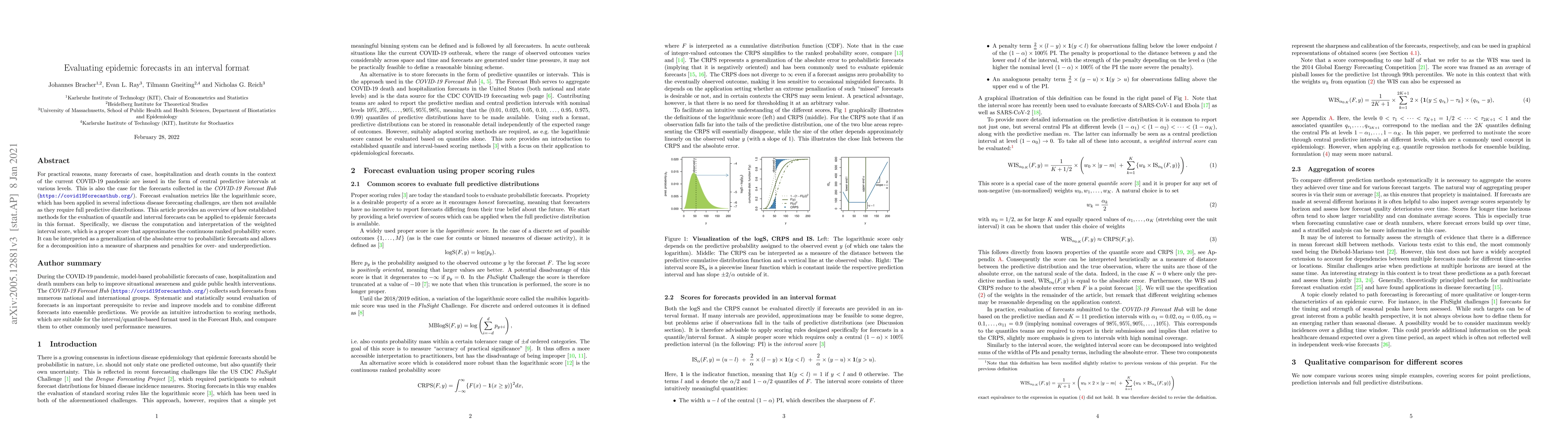 This paper discusses methods for evaluating interval-formatted epidemic forecasts, like those from the COVID-19 Forecast Hub. It introduces the weighted interval score, a proper scoring rule approximating the continuous ranked probability score, allowing for sharpness measurement and penalties for over- and underprediction, providing a comprehensive evaluation approach for such forecasts.