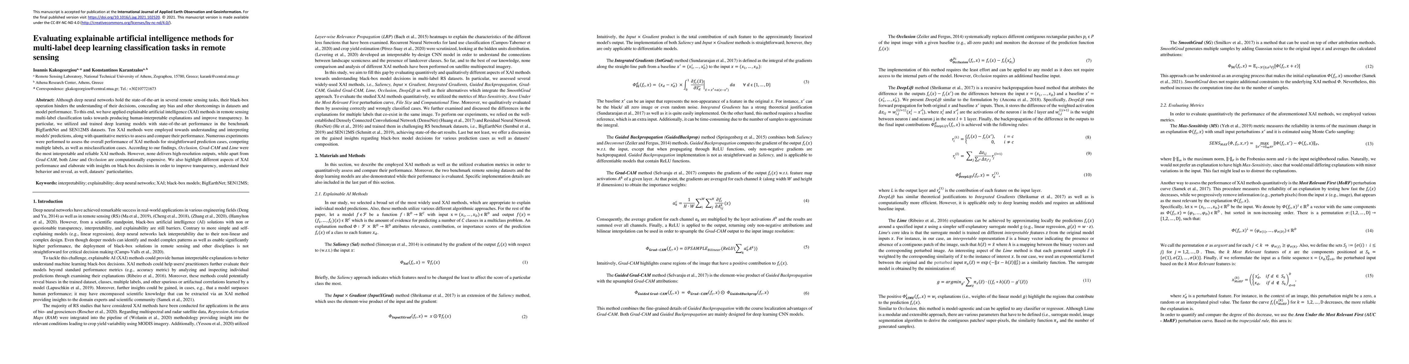 The paper presents a comprehensive evaluation of ten XAI methods for deep learning models in multi-label remote sensing classification tasks, introducing quantitative metrics for assessing their performance.