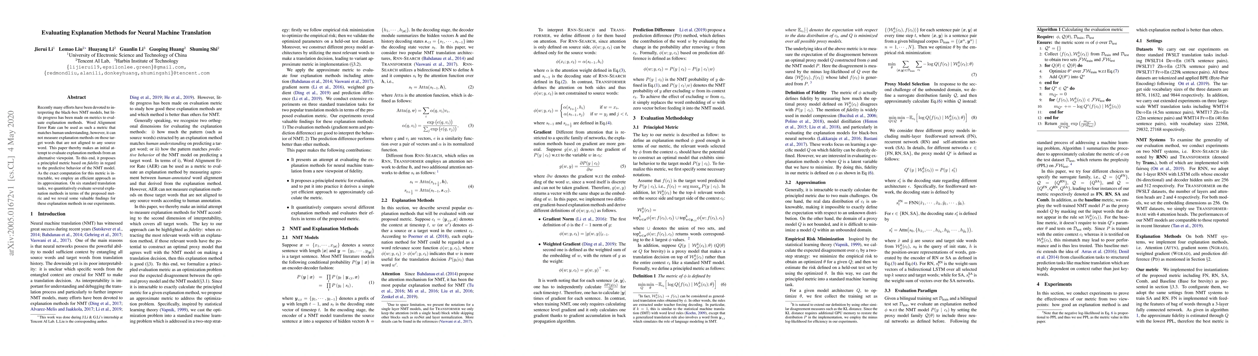 This paper proposes a principled metric for evaluating explanation methods in Neural Machine Translation (NMT) based on fidelity to the NMT model's predictive behavior. An approximation method is employed due to the intractability of the exact computation.