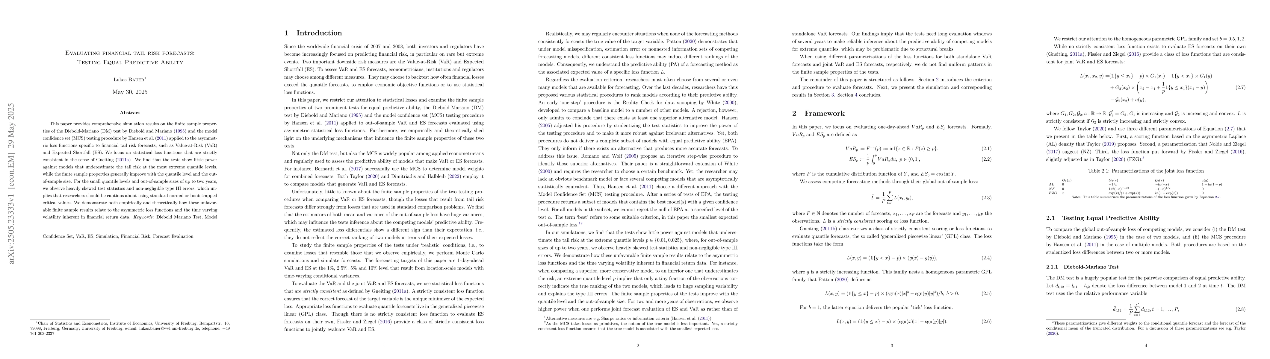The paper provides detailed simulation results and analysis of the DM test and MCS for evaluating financial tail risk forecasts, contributing to the understanding of their finite sample properties under asymmetric loss functions.