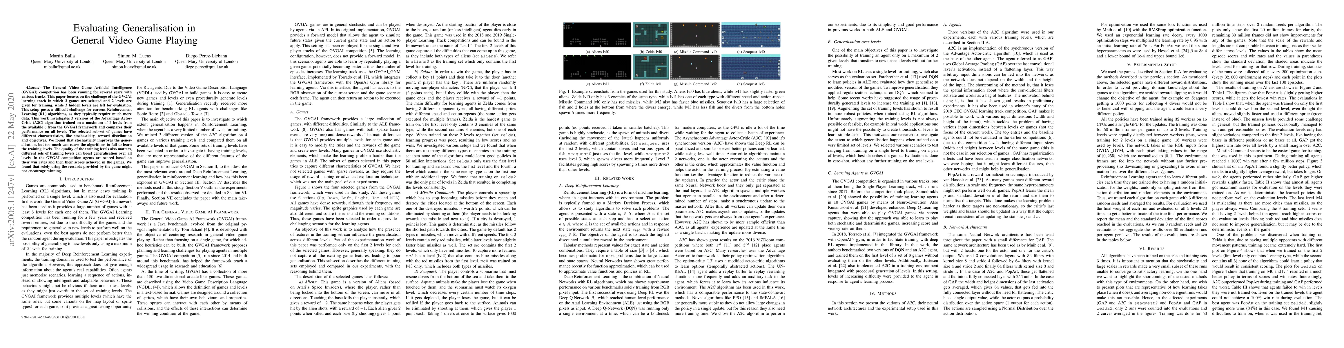 The General Video Game Artificial Intelligence (GVGAI) competition has been running for several years with various tracks. This paper focuses on the challenge of the GVGAI learning track in which 3 games are selected and 2 levels are given for training, while 3 hidden levels are left for evaluation. This setup poses a difficult challenge for current Reinforcement Learning (RL) algorithms, as they typically require much more data. This work investigates 3 versions of the Advantage Actor-Critic (A2C) algorithm trained on a maximum of 2 levels from the available 5 from the GVGAI framework and compares their performance on all levels. The selected sub-set of games have different characteristics, like stochasticity, reward distribution and objectives. We found that stochasticity improves the generalisation, but too much can cause the algorithms to fail to learn the training levels. The quality of the training levels also matters, different sets of training levels can boost generalisation over all levels. In the GVGAI competition agents are scored based on their win rates and then their scores achieved in the games. We found that solely using the rewards provided by the game might not encourage winning.