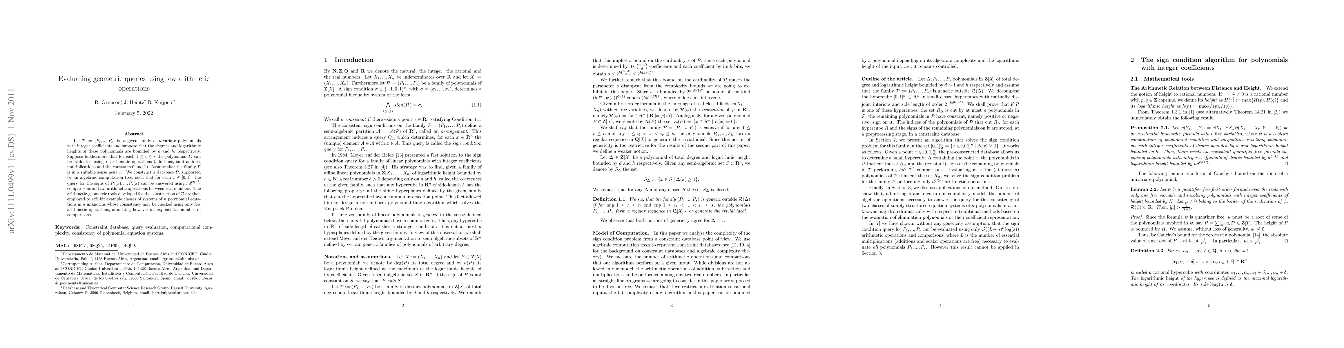 Let $\cp:=(P_1,...,P_s)$ be a given family of $n$-variate polynomials with integer coefficients and suppose that the degrees and logarithmic heights of these polynomials are bounded by $d$ and $h$, respectively. Suppose furthermore that for each $1\leq i\leq s$ the polynomial $P_i$ can be evaluated using $L$ arithmetic operations (additions, subtractions, multiplications and the constants 0 and 1). Assume that the family $\cp$ is in a suitable sense \emph{generic}. We construct a database $\cal D$, supported by an algebraic computation tree, such that for each $x\in [0,1]^n$ the query for the signs of $P_1(x),...,P_s(x)$ can be answered using $h d^{\cO(n^2)}$ comparisons and $nL$ arithmetic operations between real numbers. The arithmetic-geometric tools developed for the construction of $\cal D$ are then employed to exhibit example classes of systems of $n$ polynomial equations in $n$ unknowns whose consistency may be checked using only few arithmetic operations, admitting however an exponential number of comparisons.
