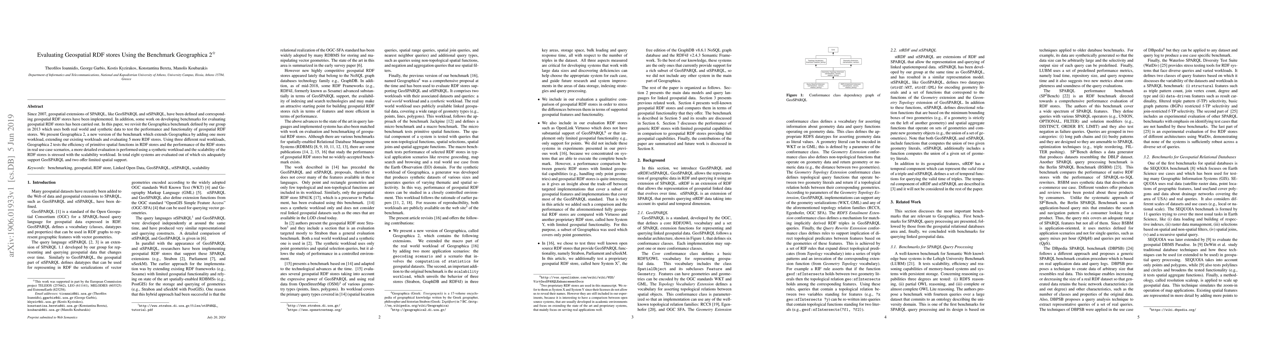 The paper evaluates geospatial RDF stores using an updated benchmark called Geographica 2, which includes three real workloads, a synthetic workload, and a scalability workload. It tests the efficiency of primitive spatial functions, performance in real use case scenarios, and scalability of RDF stores with varying sizes of datasets.