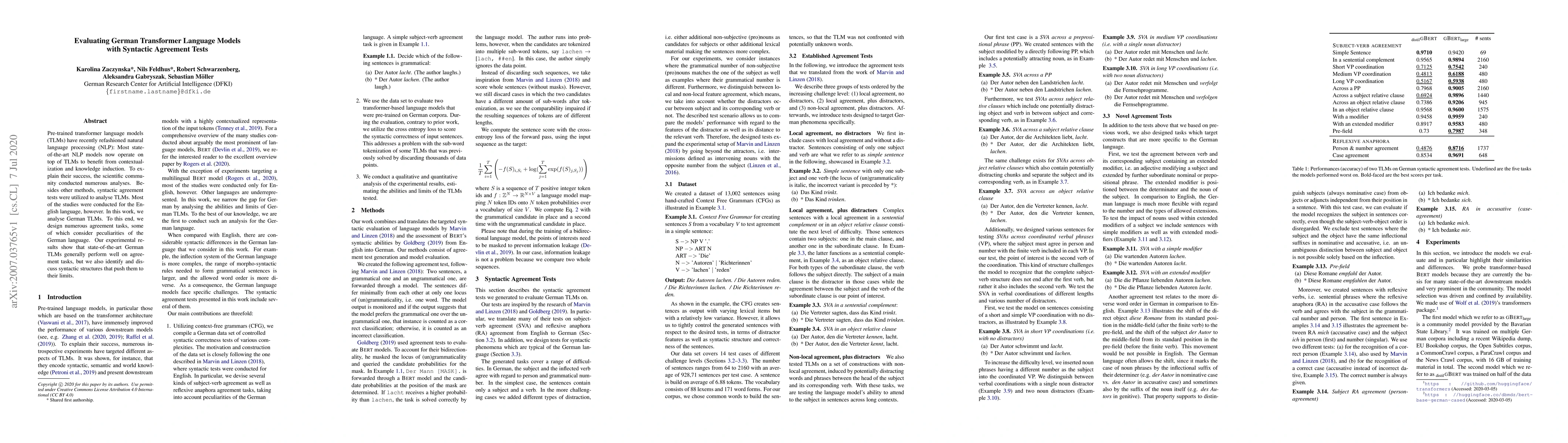 This paper evaluates the performance of state-of-the-art German transformer language models using syntactic agreement tests, revealing their strengths and limitations, particularly in handling unique German syntactic structures. The findings highlight areas for improvement in these models.