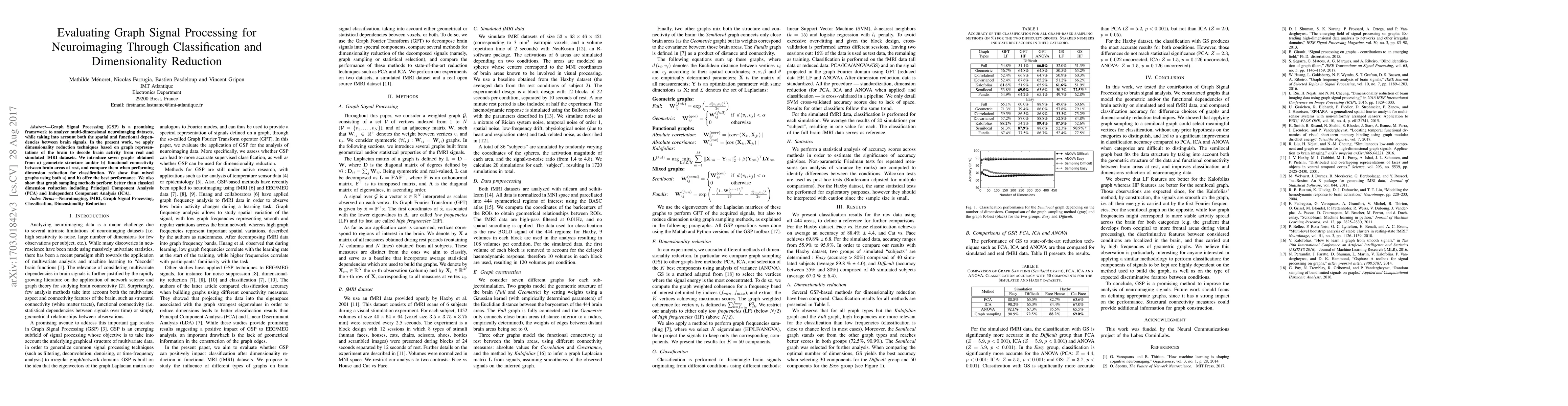 This paper evaluates Graph Signal Processing (GSP) for neuroimaging, applying dimensionality reduction to fMRI datasets. It compares seven graph types based on brain structure and functional connectivity, finding that mixed graphs yield the best classification performance, outperforming traditional methods like PCA and ICA.