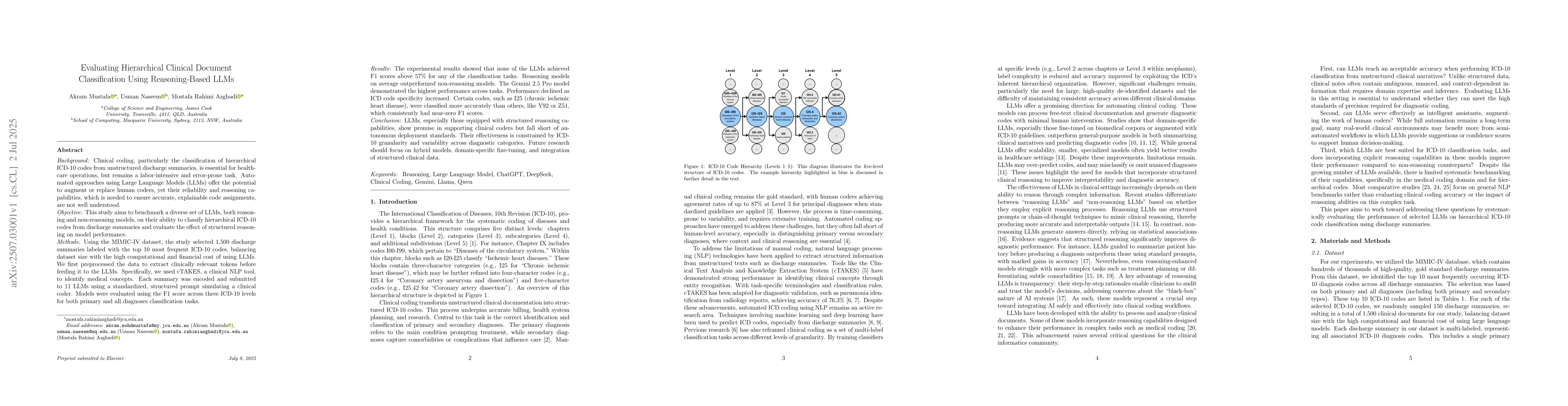 The study evaluates 11 large language models (LLMs) for classifying ICD-10 codes from hospital discharge summaries using 1,500 summaries from the MIMIC-IV dataset, focusing on the 10 most frequent ICD-10 codes and comparing models with and without reasoning capabilities.