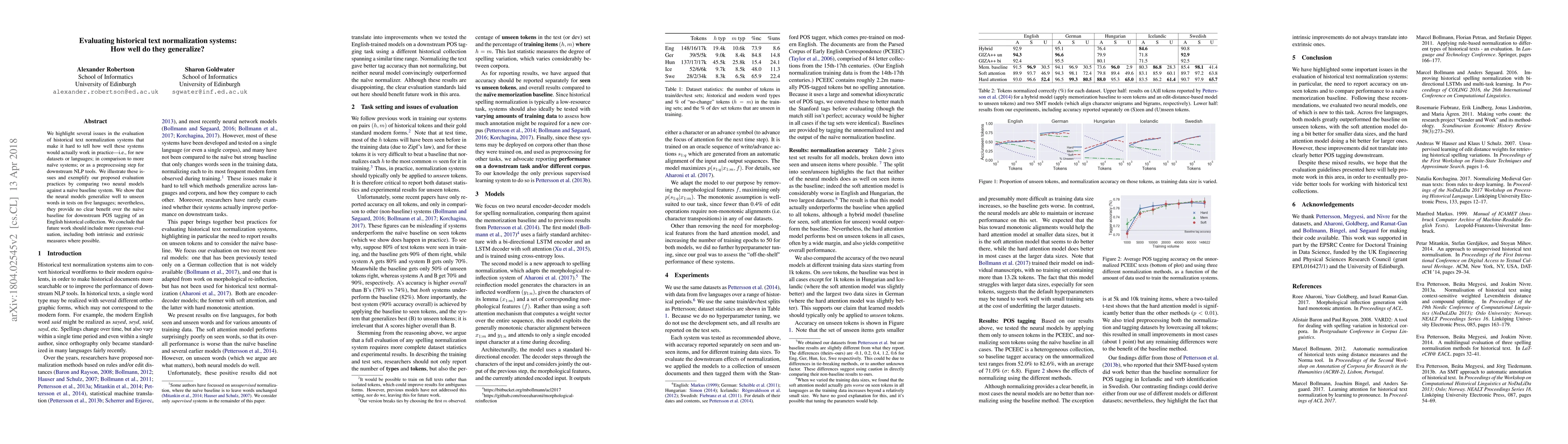 This paper evaluates the generalization of historical text normalization systems, finding that while neural models perform well on unseen words across multiple languages, they do not outperform a simple baseline for downstream POS tagging in English historical texts. The study calls for more rigorous evaluation methods.