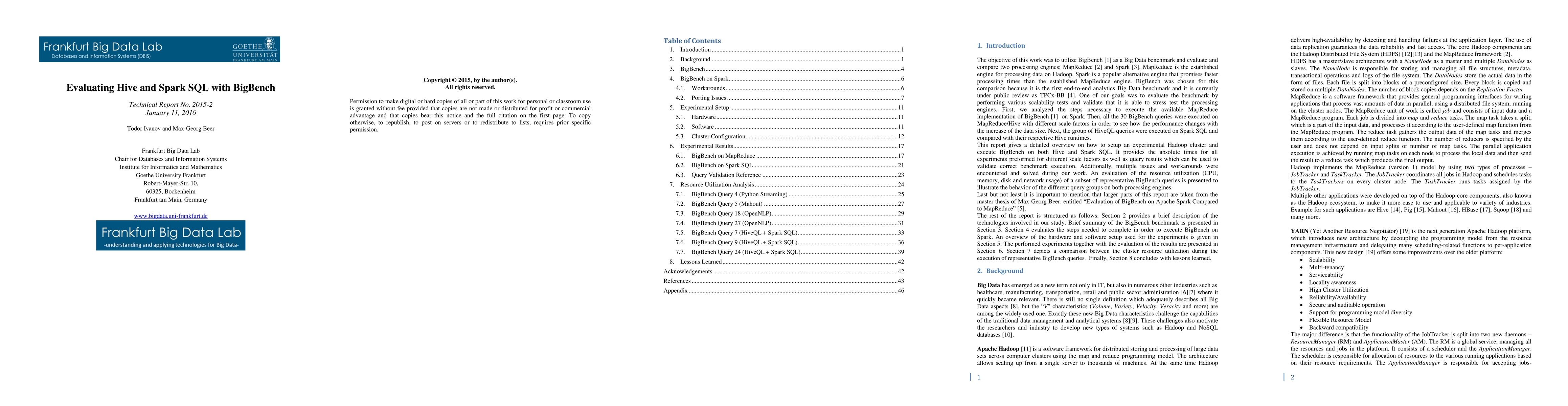 This paper evaluates the performance of MapReduce and Spark SQL using BigBench as a benchmark, comparing their processing times and scalability. It details experimental setups and execution of BigBench queries on both Hive and Spark SQL, highlighting resource utilization and performance differences.