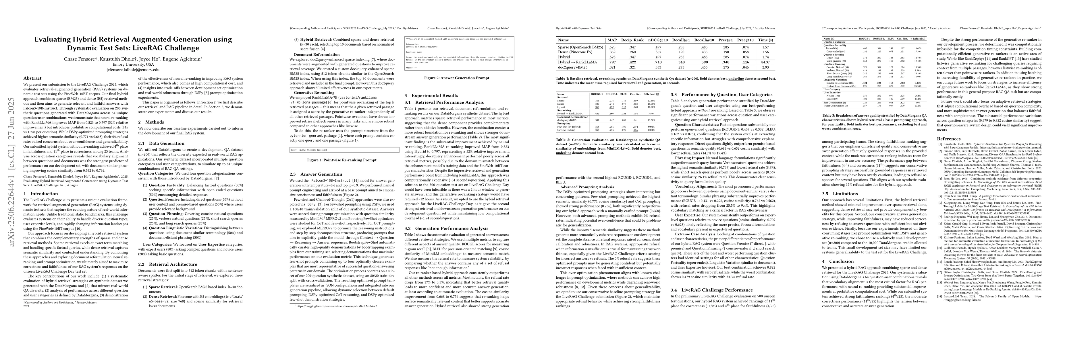 We present our submission to the LiveRAG Challenge 2025, which evaluates retrieval-augmented generation (RAG) systems on dynamic test sets using the FineWeb-10BT corpus. Our final hybrid approach combines sparse (BM25) and dense (E5) retrieval methods and then aims to generate relevant and faithful answers with Falcon3-10B-Instruct. Through systematic evaluation on 200 synthetic questions generated with DataMorgana across 64 unique question-user combinations, we demonstrate that neural re-ranking with RankLLaMA improves MAP from 0.523 to 0.797 (52% relative improvement) but introduces prohibitive computational costs (84s vs 1.74s per question). While DSPy-optimized prompting strategies achieved higher semantic similarity (0.771 vs 0.668), their 0% refusal rates raised concerns about over-confidence and generalizability. Our submitted hybrid system without re-ranking achieved 4th place in faithfulness and 11th place in correctness among 25 teams. Analysis across question categories reveals that vocabulary alignment between questions and documents was the strongest predictor of performance on our development set, with document-similar phrasing improving cosine similarity from 0.562 to 0.762.