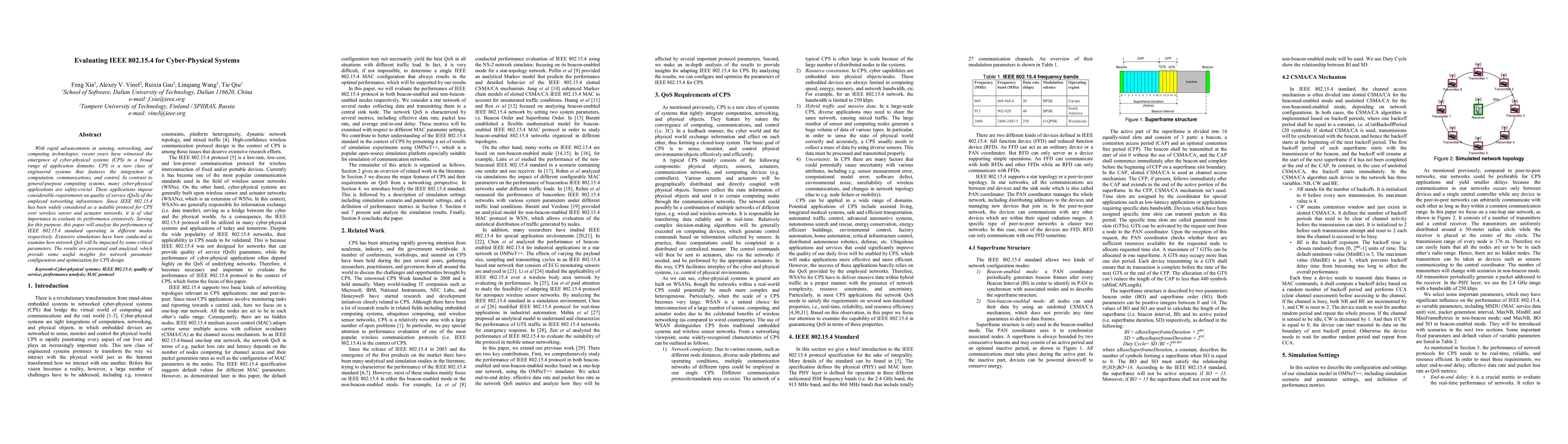 This paper evaluates the performance of IEEE 802.15.4 in cyber-physical systems, analyzing its quality of service under various operational modes through extensive simulations. The study provides insights into optimizing network parameters for safety-critical CPS applications.