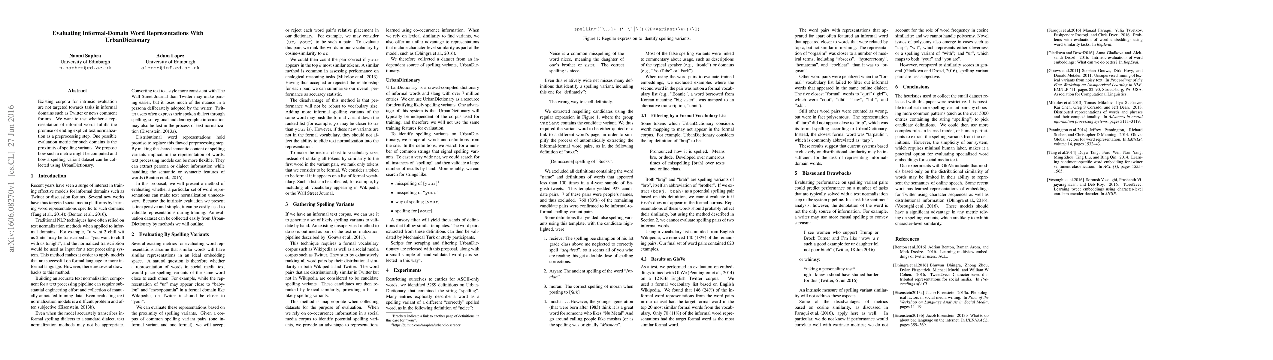Existing corpora for intrinsic evaluation are not targeted towards tasks in informal domains such as Twitter or news comment forums. We want to test whether a representation of informal words fulfills the promise of eliding explicit text normalization as a preprocessing step. One possible evaluation metric for such domains is the proximity of spelling variants. We propose how such a metric might be computed and how a spelling variant dataset can be collected using UrbanDictionary.