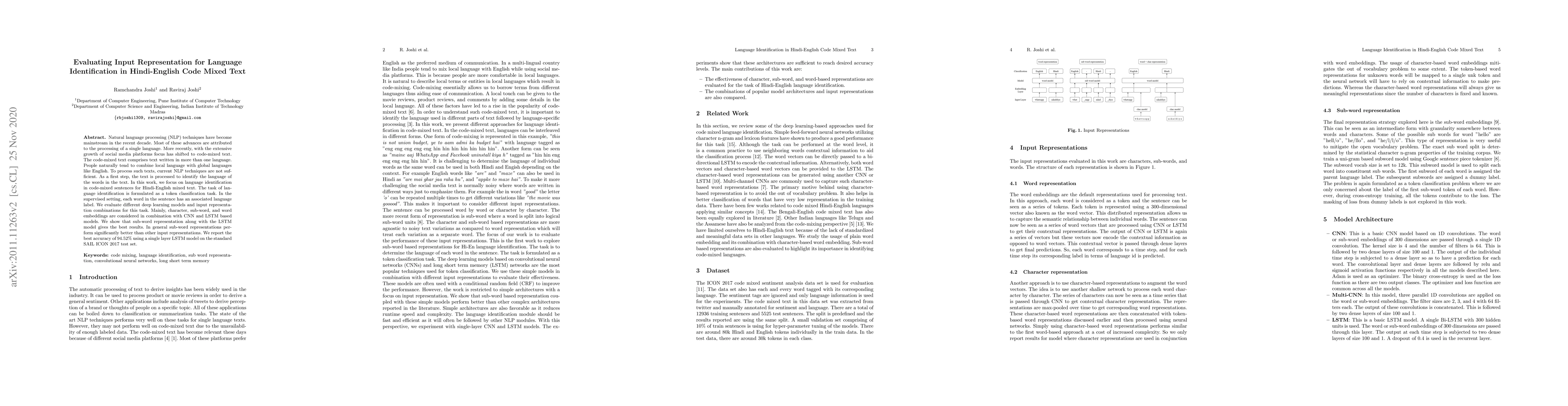 This paper evaluates various deep learning models and input representations for language identification in Hindi-English code-mixed text, finding that sub-word representations combined with LSTM models yield the best results, achieving an accuracy of 94.52%. Sub-word representations outperform character and word embeddings in this context.