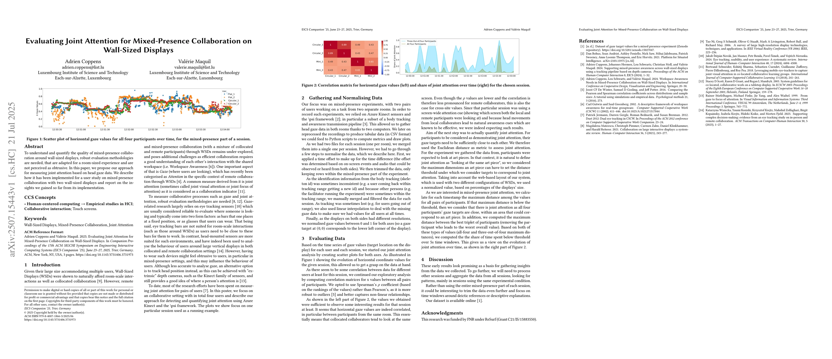To understand and quantify the quality of mixed-presence collaboration around wall-sized displays, robust evaluation methodologies are needed, that are adapted for a room-sized experience and are not perceived as obtrusive. In this paper, we propose our approach for measuring joint attention based on head gaze data. We describe how it has been implemented for a user study on mixed presence collaboration with two wall-sized displays and report on the insights we gained so far from its implementation, with a preliminary focus on the data coming from one particular session.