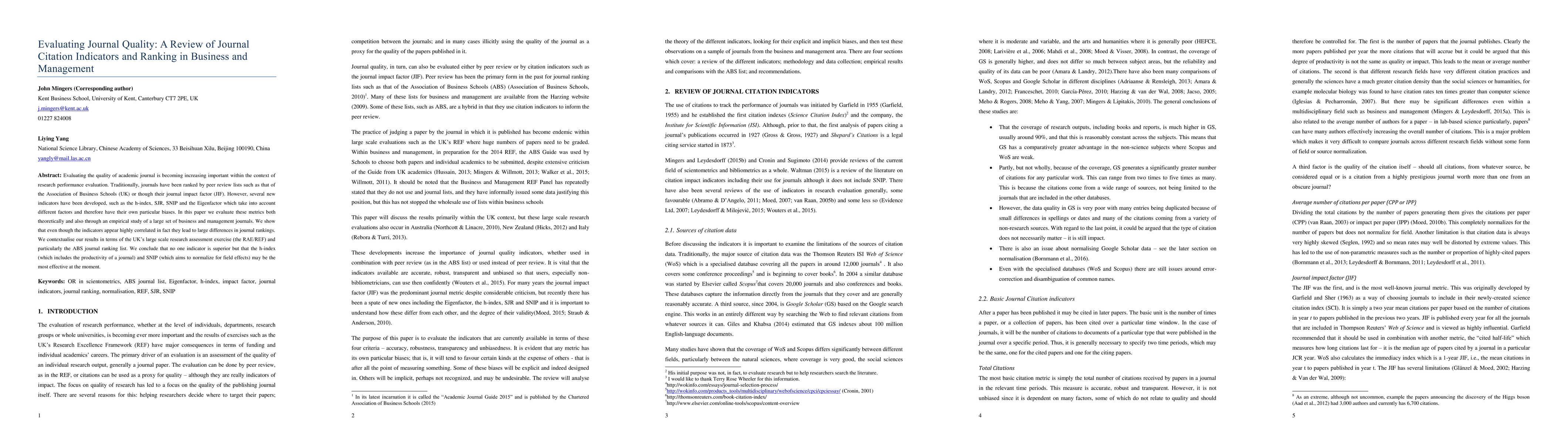 This paper reviews various journal citation indicators and their effectiveness in evaluating the quality of business and management journals, finding significant differences in rankings despite high correlations among the metrics. The study concludes that no single indicator is superior, but the h-index and SNIP show promise for assessing journal quality.