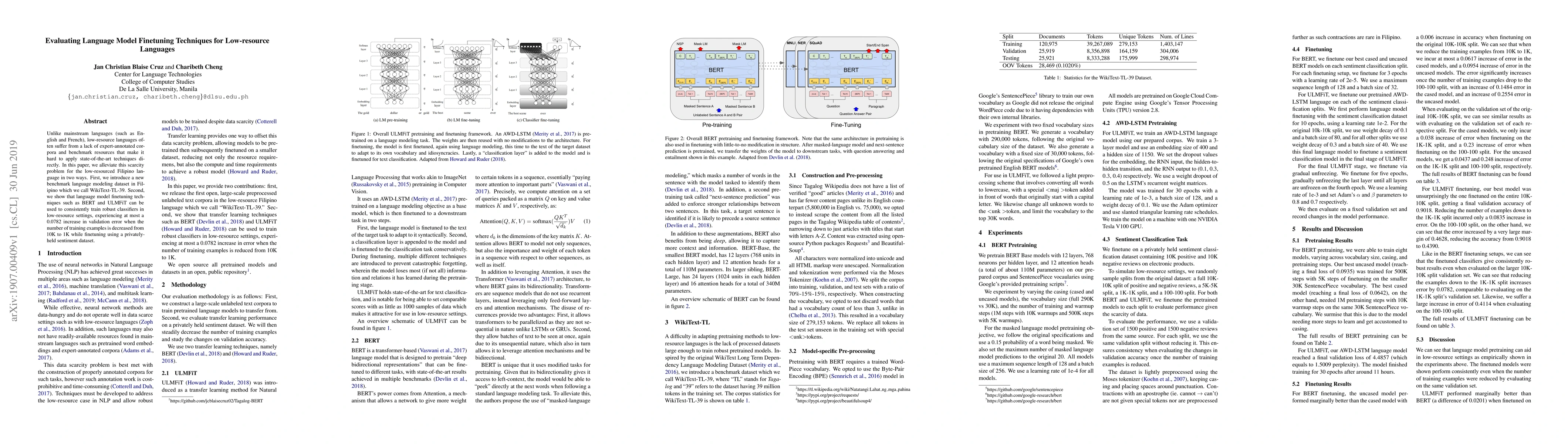 Unlike mainstream languages (such as English and French), low-resource languages often suffer from a lack of expert-annotated corpora and benchmark resources that make it hard to apply state-of-the-art techniques directly. In this paper, we alleviate this scarcity problem for the low-resourced Filipino language in two ways. First, we introduce a new benchmark language modeling dataset in Filipino which we call WikiText-TL-39. Second, we show that language model finetuning techniques such as BERT and ULMFiT can be used to consistently train robust classifiers in low-resource settings, experiencing at most a 0.0782 increase in validation error when the number of training examples is decreased from 10K to 1K while finetuning using a privately-held sentiment dataset.