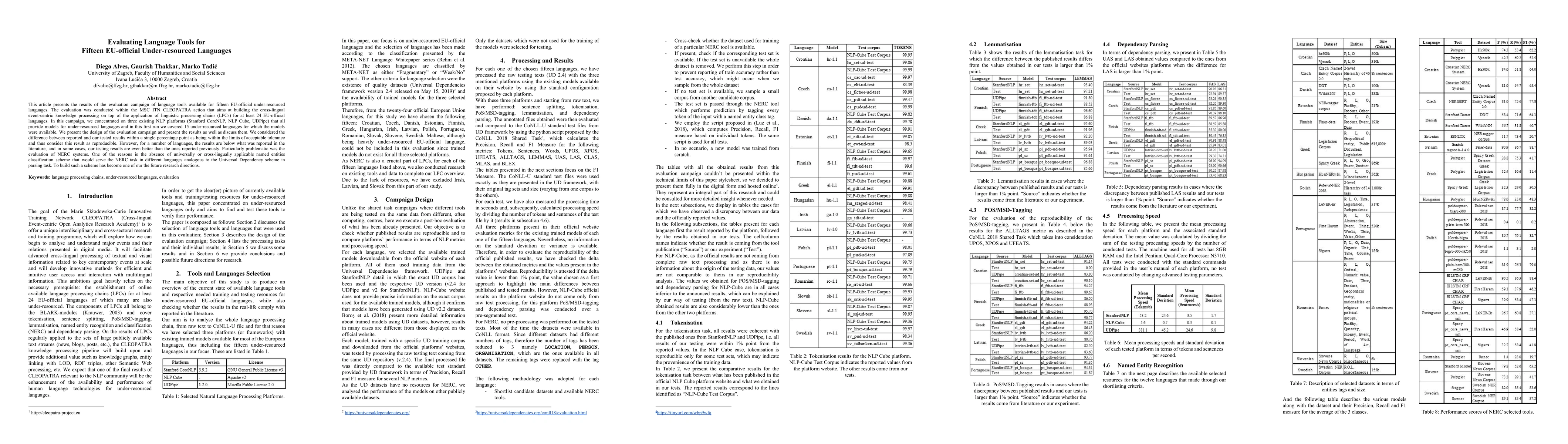 This study evaluates three NLP platforms for language tools supporting fifteen under-resourced EU-official languages, finding mixed results with some models performing better than previously reported. Challenges in named entity recognition highlight the need for a cross-lingual classification scheme.