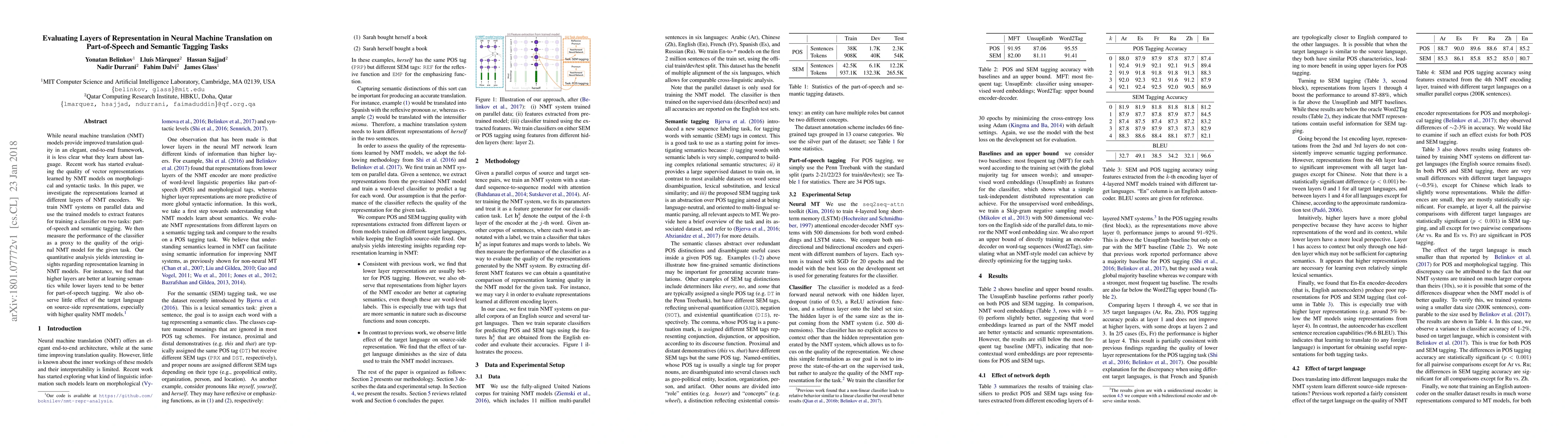 While neural machine translation (NMT) models provide improved translation quality in an elegant, end-to-end framework, it is less clear what they learn about language. Recent work has started evaluating the quality of vector representations learned by NMT models on morphological and syntactic tasks. In this paper, we investigate the representations learned at different layers of NMT encoders. We train NMT systems on parallel data and use the trained models to extract features for training a classifier on two tasks: part-of-speech and semantic tagging. We then measure the performance of the classifier as a proxy to the quality of the original NMT model for the given task. Our quantitative analysis yields interesting insights regarding representation learning in NMT models. For instance, we find that higher layers are better at learning semantics while lower layers tend to be better for part-of-speech tagging. We also observe little effect of the target language on source-side representations, especially with higher quality NMT models.
