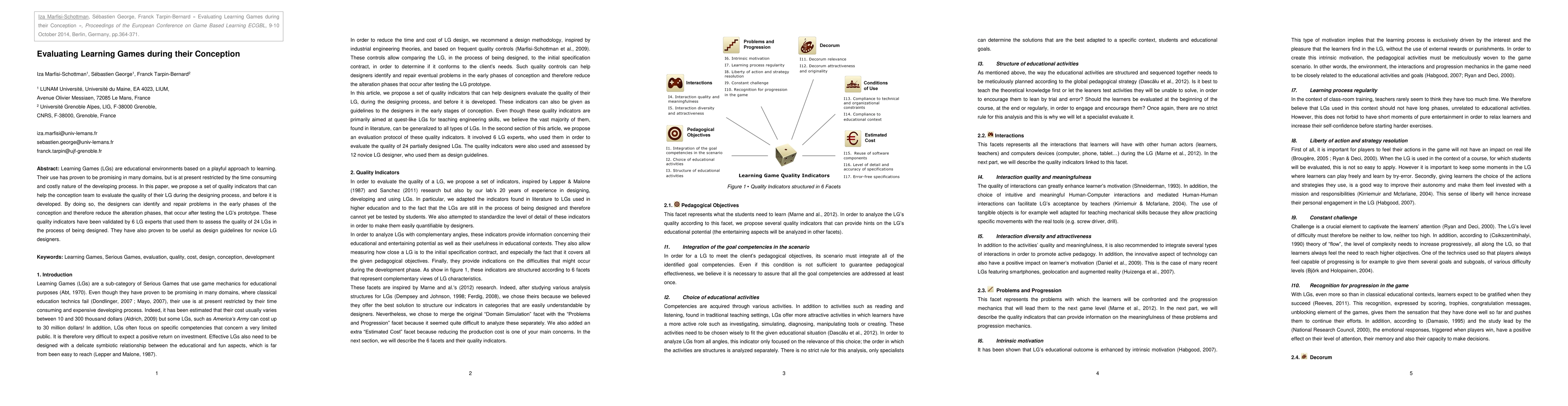 This paper proposes quality indicators to evaluate Learning Games during their conception phase, aiming to identify and rectify issues early, thus reducing costly alterations later. The indicators were validated by experts and found useful for guiding novice designers.