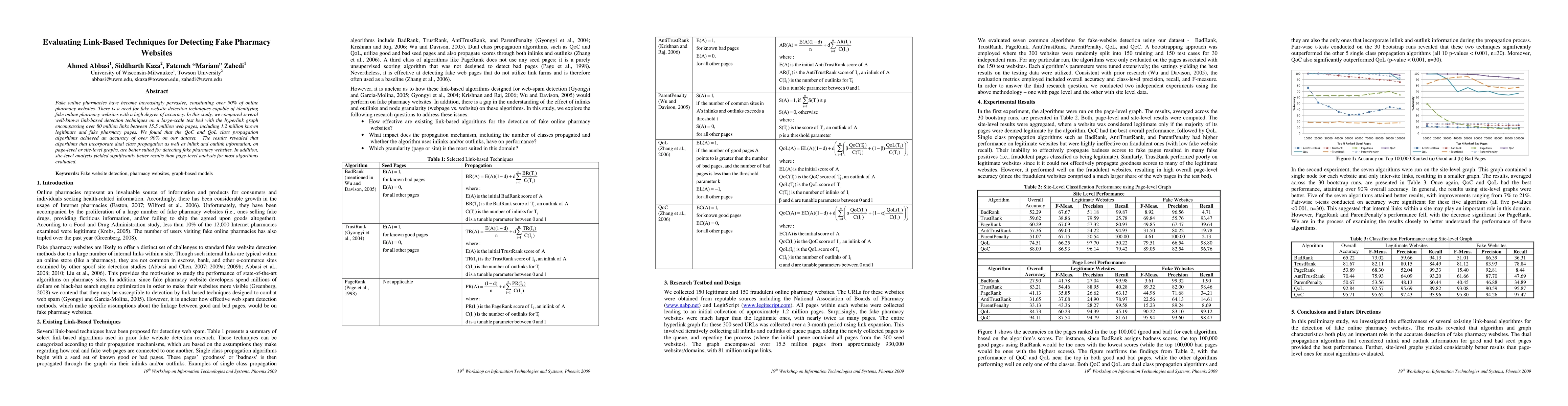Researchers evaluated link-based techniques to detect fake online pharmacy websites, finding that site-level analysis with dual class propagation achieved over 90% accuracy. This approach outperformed page-level analysis for most algorithms.
