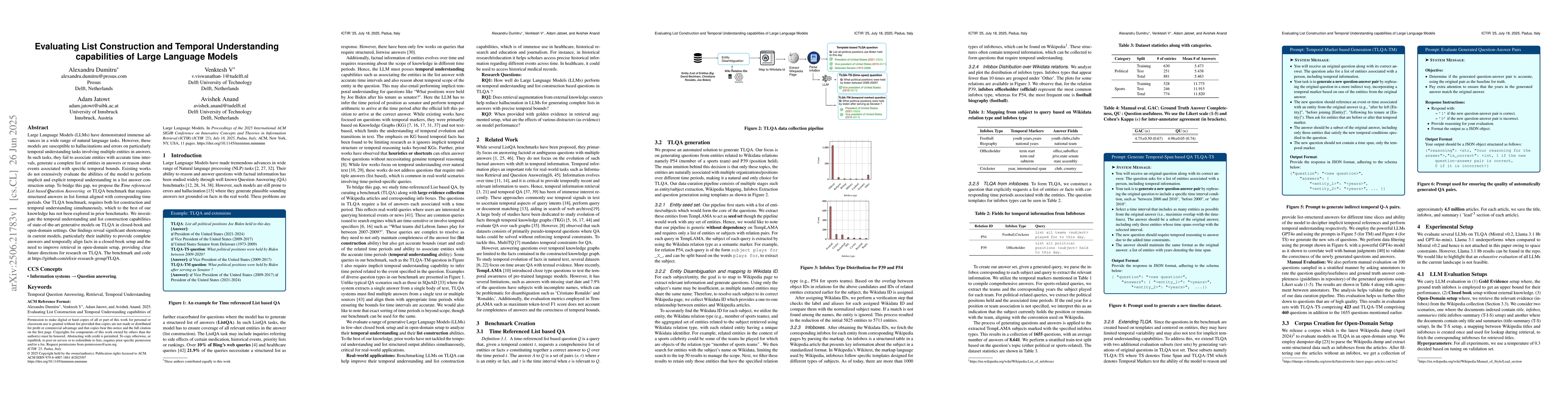 Large Language Models (LLMs) have demonstrated immense advances in a wide range of natural language tasks. However, these models are susceptible to hallucinations and errors on particularly temporal understanding tasks involving multiple entities in answers. In such tasks, they fail to associate entities with accurate time intervals, generate a complete list of entities in answers or reason about events associated with specific temporal bounds. Existing works do not extensively evaluate the abilities of the model to perform implicit and explicit temporal understanding in a list answer construction setup. To bridge this gap, we propose the Time referenced List based Question Answering or TLQA benchmark that requires structured answers in list format aligned with corresponding time periods. Our TLQA benchmark, requires both list construction and temporal understanding simultaneously, which to the best of our knowledge has not been explored in prior benchmarks. We investigate the temporal understanding and list construction capabilities of state-of-the-art generative models on TLQA in closed-book and open-domain settings. Our findings reveal significant shortcomings in current models, particularly their inability to provide complete answers and temporally align facts in a closed-book setup and the need to improve retrieval in open-domain setup, providing clear future directions for research on TLQA. The benchmark and code at https://github.com/elixir-research-group/TLQA.