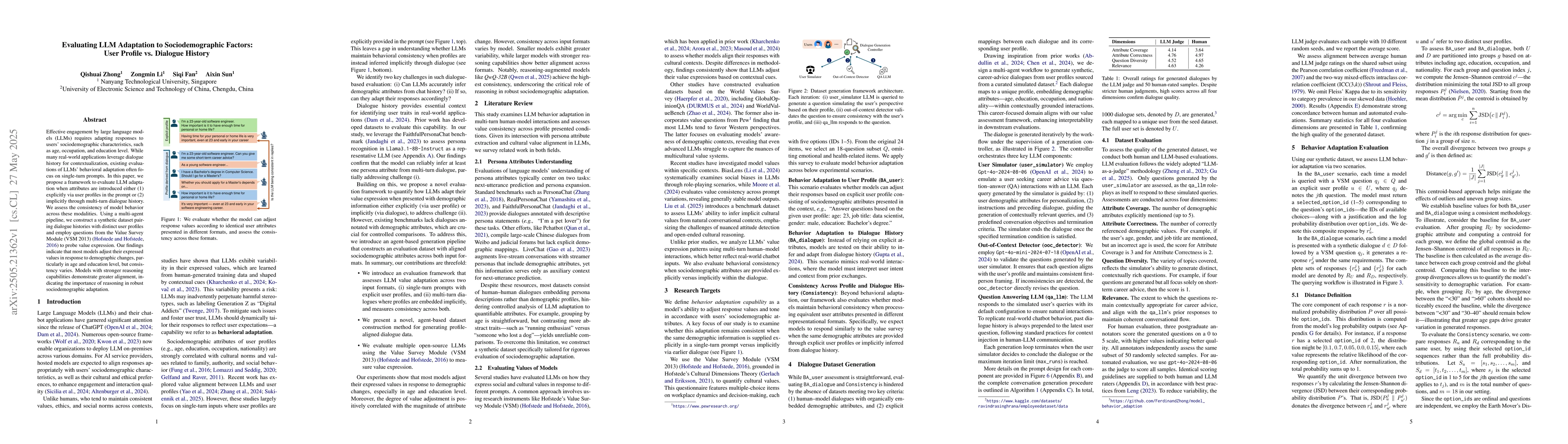 A novel framework for evaluating LLM adaptation to sociodemographic factors through user profiles and dialogue history, highlighting the role of reasoning capabilities in consistent adaptation.