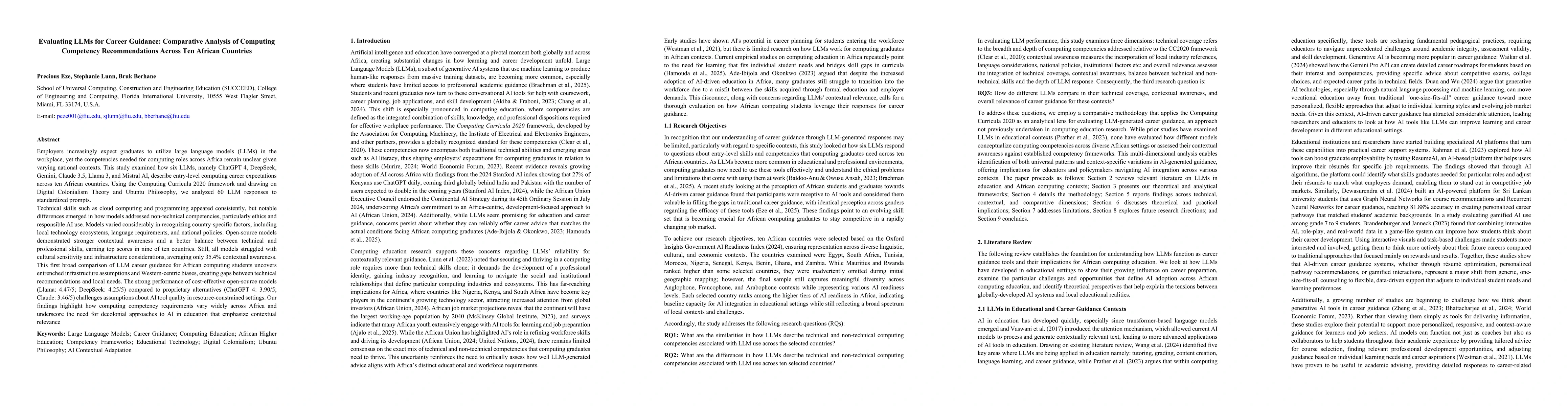 Employers increasingly expect graduates to utilize large language models (LLMs) in the workplace, yet the competencies needed for computing roles across Africa remain unclear given varying national contexts. This study examined how six LLMs, namely ChatGPT 4, DeepSeek, Gemini, Claude 3.5, Llama 3, and Mistral AI, describe entry-level computing career expectations across ten African countries. Using the Computing Curricula 2020 framework and drawing on Digital Colonialism Theory and Ubuntu Philosophy, we analyzed 60 LLM responses to standardized prompts. Technical skills such as cloud computing and programming appeared consistently, but notable differences emerged in how models addressed non-technical competencies, particularly ethics and responsible AI use. Models varied considerably in recognizing country-specific factors, including local technology ecosystems, language requirements, and national policies. Open-source models demonstrated stronger contextual awareness and a better balance between technical and professional skills, earning top scores in nine of ten countries. Still, all models struggled with cultural sensitivity and infrastructure considerations, averaging only 35.4% contextual awareness. This first broad comparison of LLM career guidance for African computing students uncovers entrenched infrastructure assumptions and Western-centric biases, creating gaps between technical recommendations and local needs. The strong performance of cost-effective open-source models (Llama: 4.47/5; DeepSeek: 4.25/5) compared to proprietary alternatives (ChatGPT 4: 3.90/5; Claude: 3.46/5) challenges assumptions about AI tool quality in resource-constrained settings. Our findings highlight how computing competency requirements vary widely across Africa and underscore the need for decolonial approaches to AI in education that emphasize contextual relevance