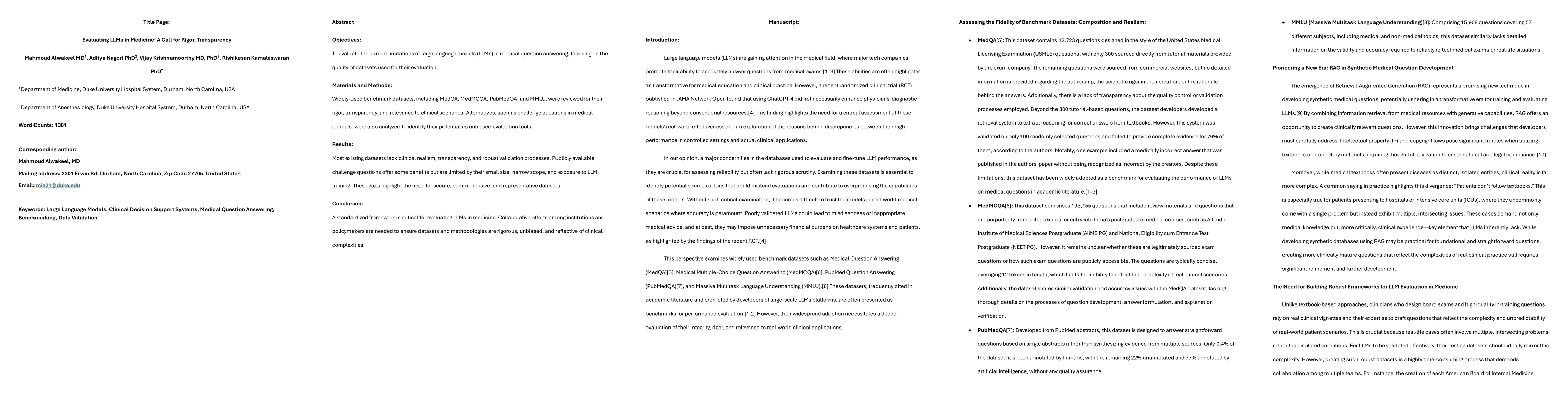 Objectives: To evaluate the current limitations of large language models (LLMs) in medical question answering, focusing on the quality of datasets used for their evaluation. Materials and Methods: Widely-used benchmark datasets, including MedQA, MedMCQA, PubMedQA, and MMLU, were reviewed for their rigor, transparency, and relevance to clinical scenarios. Alternatives, such as challenge questions in medical journals, were also analyzed to identify their potential as unbiased evaluation tools. Results: Most existing datasets lack clinical realism, transparency, and robust validation processes. Publicly available challenge questions offer some benefits but are limited by their small size, narrow scope, and exposure to LLM training. These gaps highlight the need for secure, comprehensive, and representative datasets. Conclusion: A standardized framework is critical for evaluating LLMs in medicine. Collaborative efforts among institutions and policymakers are needed to ensure datasets and methodologies are rigorous, unbiased, and reflective of clinical complexities.