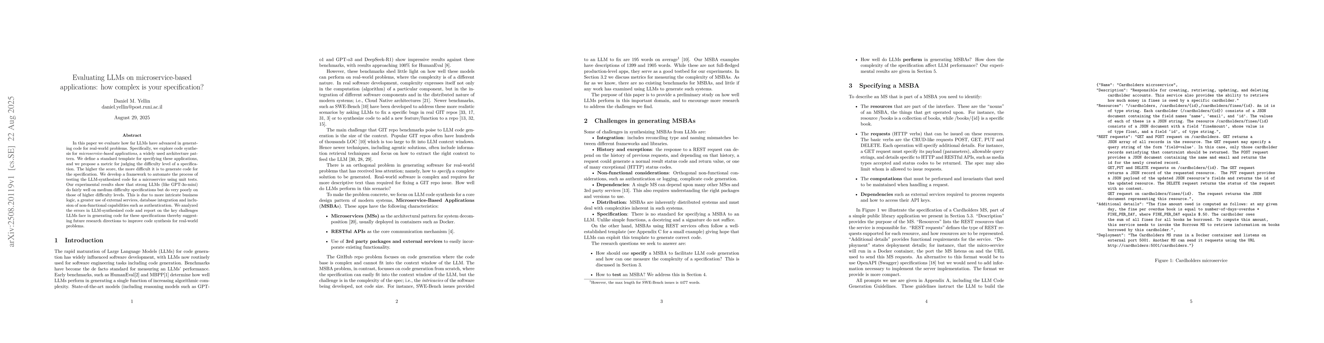 In this paper we evaluate how far LLMs have advanced in generating code for real-world problems. Specifically, we explore code synthesis for microservice-based applications, a widely used architecture pattern. We define a standard template for specifying these applications, and we propose a metric for judging the difficulty level of a specification. The higher the score, the more difficult it is to generate code for the specification. We develop a framework to automate the process of testing LLM-synthesized code for a microservice using unit tests. Our experimental results show that strong LLMs (like GPT-3o-mini) do fairly well on medium difficulty specifications but do very poorly on those of higher difficulty levels. This is due to more intricate business logic, a greater use of external services, database integration and inclusion of non-functional capabilities such as authentication. We analyzed the errors in LLM-synthesized code and report on the key challenges LLMs face in generating code for these specifications thereby suggesting future research directions to improve code synthesis for real-world problems.