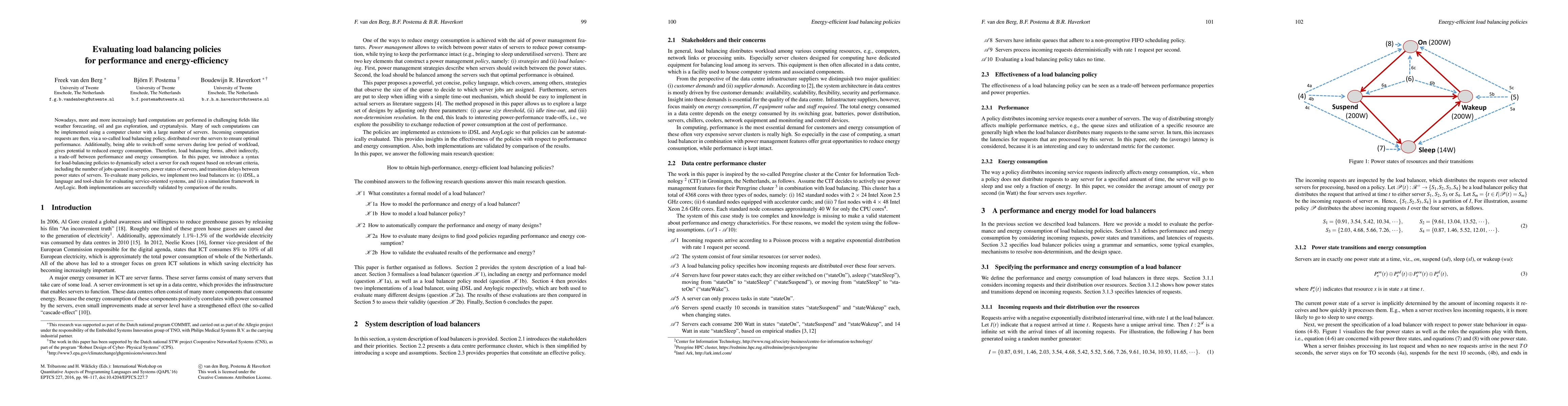 This paper evaluates various load balancing policies to balance performance and energy efficiency in computer clusters. It introduces a syntax for dynamic server selection based on job queues, power states, and transition delays, and validates two implementations using iDSL and AnyLogic simulation.