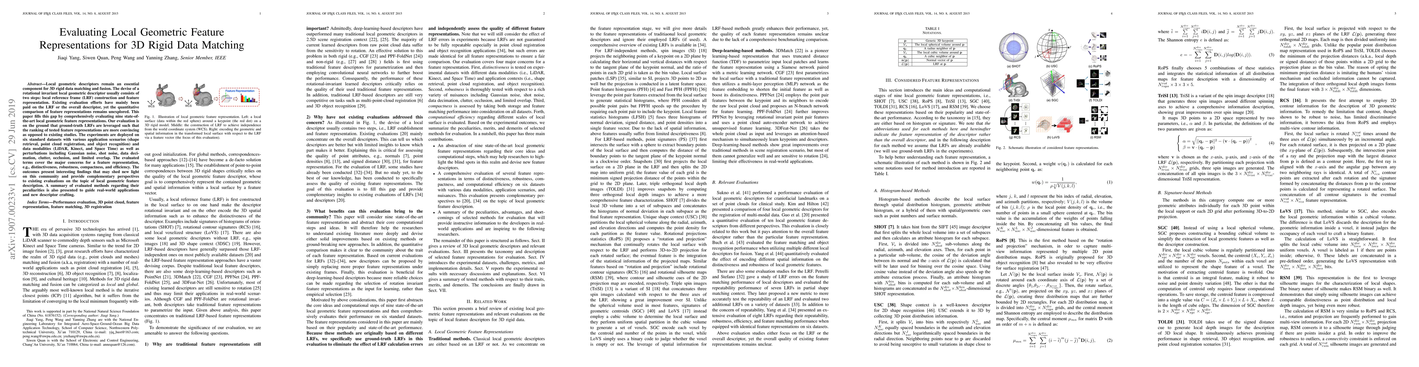 This paper evaluates nine state-of-the-art local geometric feature representations for 3D rigid data matching, focusing on their distinctiveness, robustness, compactness, and efficiency. The study leverages ground-truth local reference frames for a more convincing ranking, testing on six datasets with various perturbations and application scenarios.