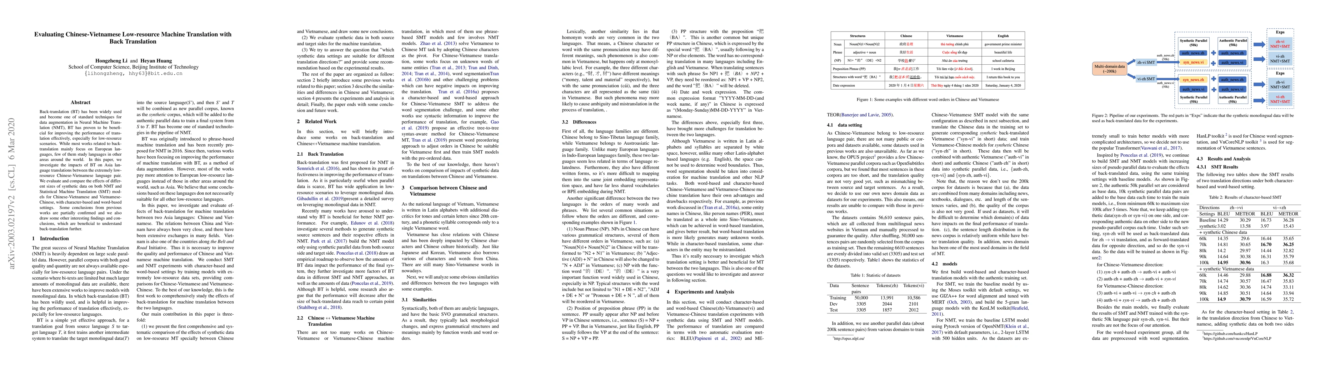 This paper evaluates the effectiveness of back-translation for low-resource machine translation between Chinese and Vietnamese, comparing synthetic data sizes on Neural Machine Translation and Statistical Machine Translation models. Findings provide insights into back-translation's impact on Asian language pairs, confirming and extending previous conclusions.