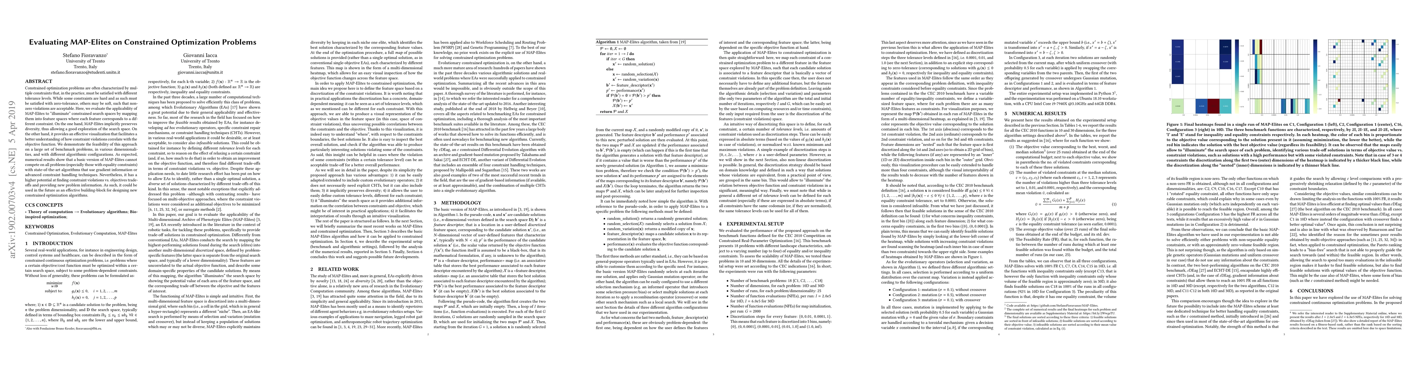 This paper evaluates MAP-Elites for solving constrained optimization problems by mapping them into feature spaces, showing that it effectively illuminates search spaces and reveals correlations between constraint violations and objectives. While it doesn't outperform state-of-the-art methods on all problems, it holds potential for discovering trade-offs and informing the development of new optimization algorithms.