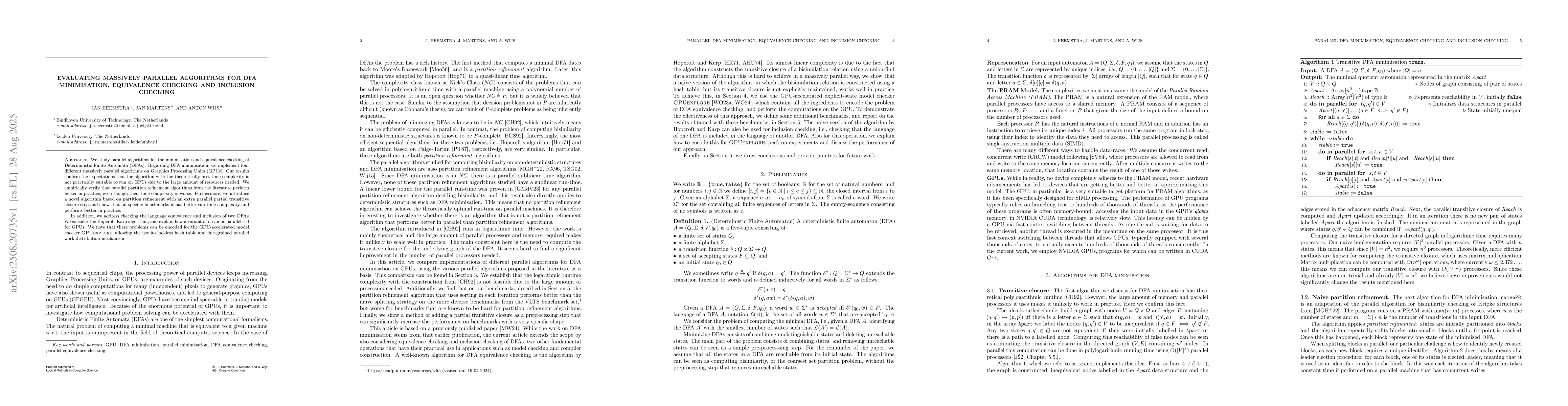 We study parallel algorithms for the minimisation and equivalence checking of Deterministic Finite Automata (DFAs). Regarding DFA minimisation, we implement four different massively parallel algorithms on Graphics Processing Units~(GPUs). Our results confirm the expectations that the algorithm with the theoretically best time complexity is not practically suitable to run on GPUs due to the large amount of resources needed. We empirically verify that parallel partition refinement algorithms from the literature perform better in practice, even though their time complexity is worse. Furthermore, we introduce a novel algorithm based on partition refinement with an extra parallel partial transitive closure step and show that on specific benchmarks it has better run-time complexity and performs better in practice. In addition, we address checking the language equivalence and inclusion of two DFAs. We consider the Hopcroft-Karp algorithm, and explain how a variant of it can be parallelised for GPUs. We note that these problems can be encoded for the GPU-accelerated model checker \GPUexplore, allowing the use its lockless hash table and fine-grained parallel work distribution mechanism.