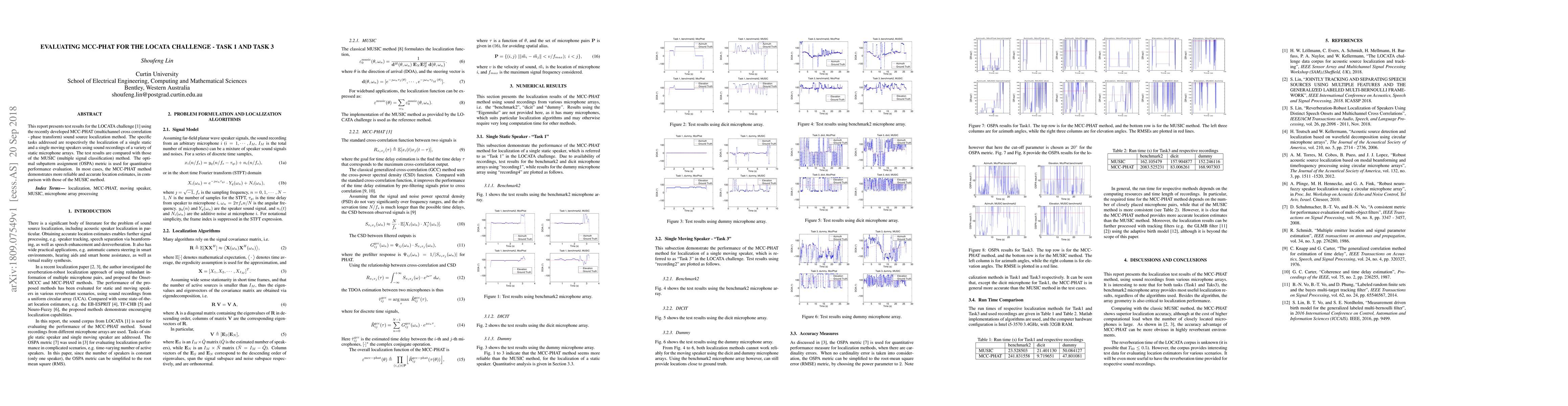 This report presents test results for the \mbox{LOCATA} challenge \cite{lollmann2018locata} using the recently developed MCC-PHAT (multichannel cross correlation - phase transform) sound source localization method. The specific tasks addressed are respectively the localization of a single static and a single moving speakers using sound recordings of a variety of static microphone arrays. The test results are compared with those of the MUSIC (multiple signal classification) method. The optimal subpattern assignment (OSPA) metric is used for quantitative performance evaluation. In most cases, the MCC-PHAT method demonstrates more reliable and accurate location estimates, in comparison with those of the MUSIC method.