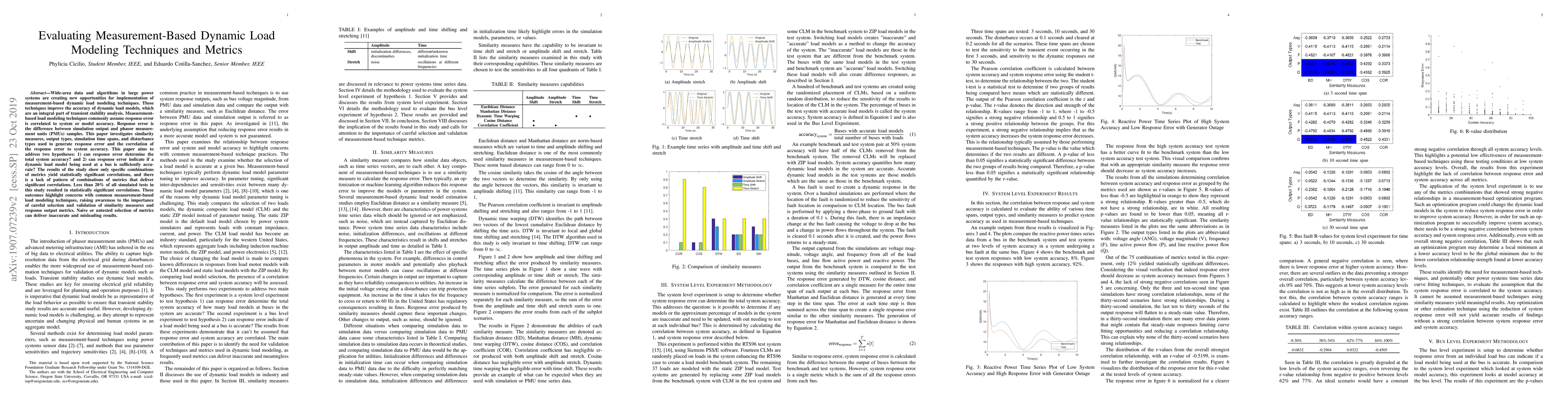 Wide-area data and algorithms in large power systems are creating new opportunities for implementation of measurement-based dynamic load modeling techniques. These techniques improve the accuracy of dynamic load models, which are an integral part of transient stability analysis. Measurement-based load modeling techniques commonly assume response error is correlated to system or model accuracy. Response error is the difference between simulation output and phasor measurement units (PMUs) samples. This paper investigates similarity measures, output types, simulation time spans, and disturbance types used to generate response error and the correlation of the response error to system accuracy. This paper aims to address two hypotheses: 1) can response error determine the total system accuracy? and 2) can response error indicate if a dynamic load model being used at a bus is sufficiently accurate? The results of the study show only specific combinations of metrics yield statistically significant correlations, and there is a lack of pattern of combinations of metrics that deliver significant correlations. Less than 20% of all simulated tests in this study resulted in statistically significant correlations. These outcomes highlight concerns with common measurement-based load modeling techniques, raising awareness to the importance of careful selection and validation of similarity measures and response output metrics. Naive or untested selection of metrics can deliver inaccurate and misleading results.