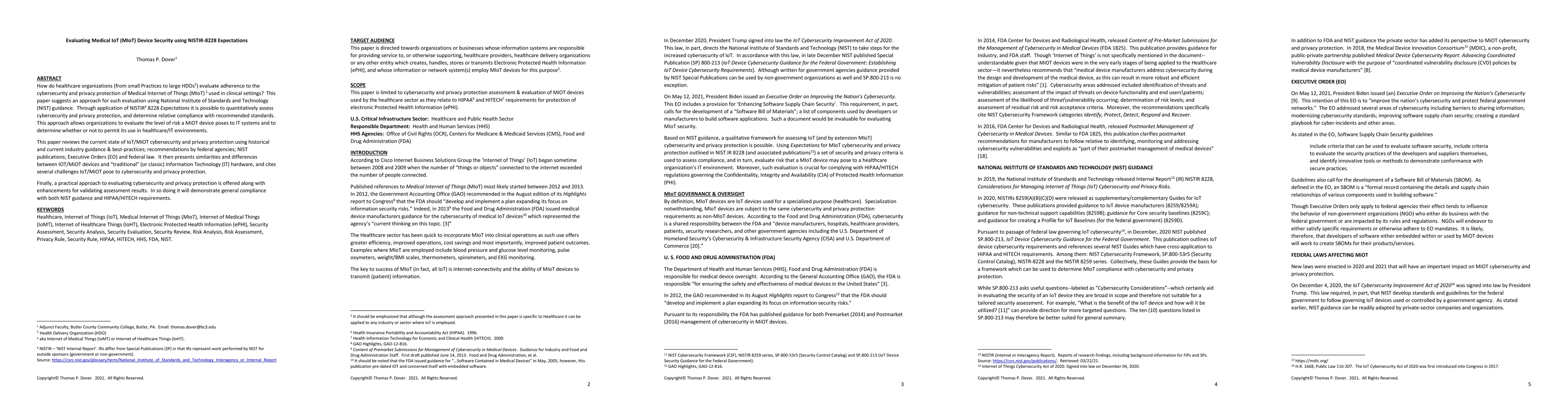 How do healthcare organizations (from small Practices to large HDOs) evaluate adherence to the cybersecurity and privacy protection of Medical Internet of Things (MIoT) used in clinical settings? This paper suggests an approach for such evaluation using National Institute of Standards and Technology (NIST) guidance. Through application of NISTIR 8228 Expectations it is possible to quantitatively assess cybersecurity and privacy protection, and determine relative compliance with recommended standards. This approach allows organizations to evaluate the level of risk a MiOT device poses to IT systems and to determine whether or not to permit its use in healthcare/IT environments. This paper reviews the current state of IoT/MiOT cybersecurity and privacy protection using historical and current industry guidance & best-practices; recommendations by federal agencies; NIST publications; and federal law. It then presents similarities and differences between IOT/MiOT devices and "traditional" (or classic) Information Technology (IT) hardware, and cites several challenges IoT/MiOT pose to cybersecurity and privacy protection. Finally, a practical approach to evaluating cybersecurity and privacy protection is offered along with enhancements for validating assessment results. In so doing it will demonstrate general compliance with both NIST guidance and HIPAA/HITECH requirements.