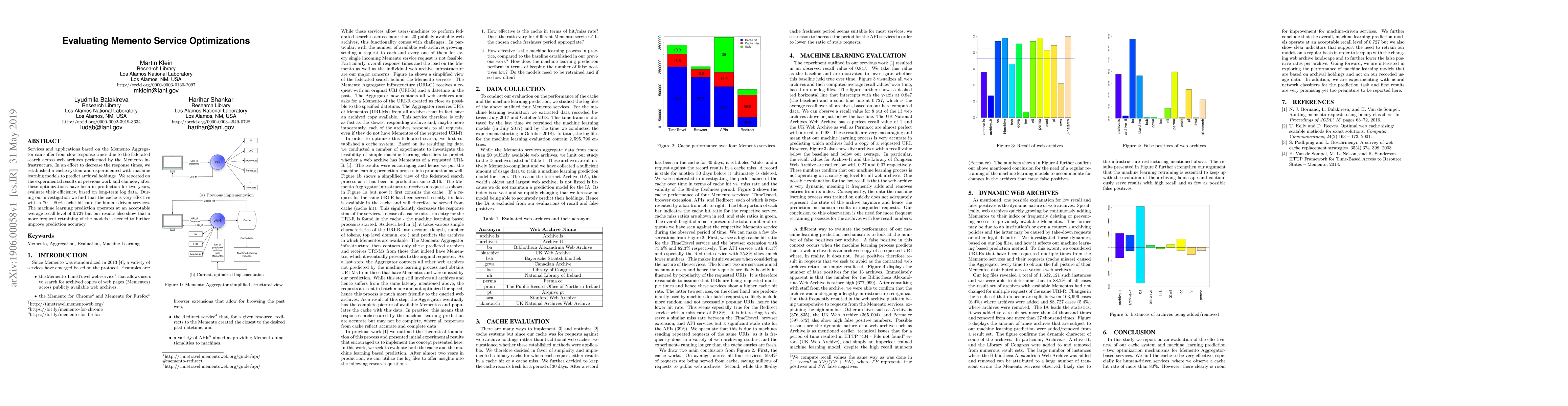 A cache system and machine learning models improved response times for Memento-based services, achieving a 70-80% cache hit rate and 72.7% average recall level in long-term log data.