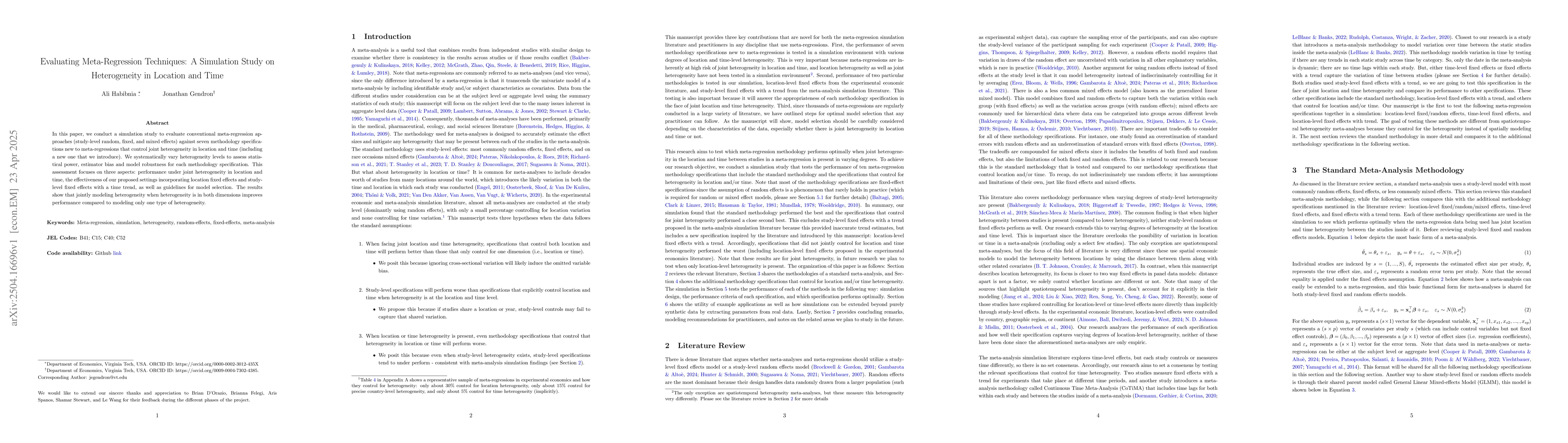 A simulation study evaluates meta-regression techniques for controlling heterogeneity in location and time, finding that jointly modeling both improves performance over single-dimension models.