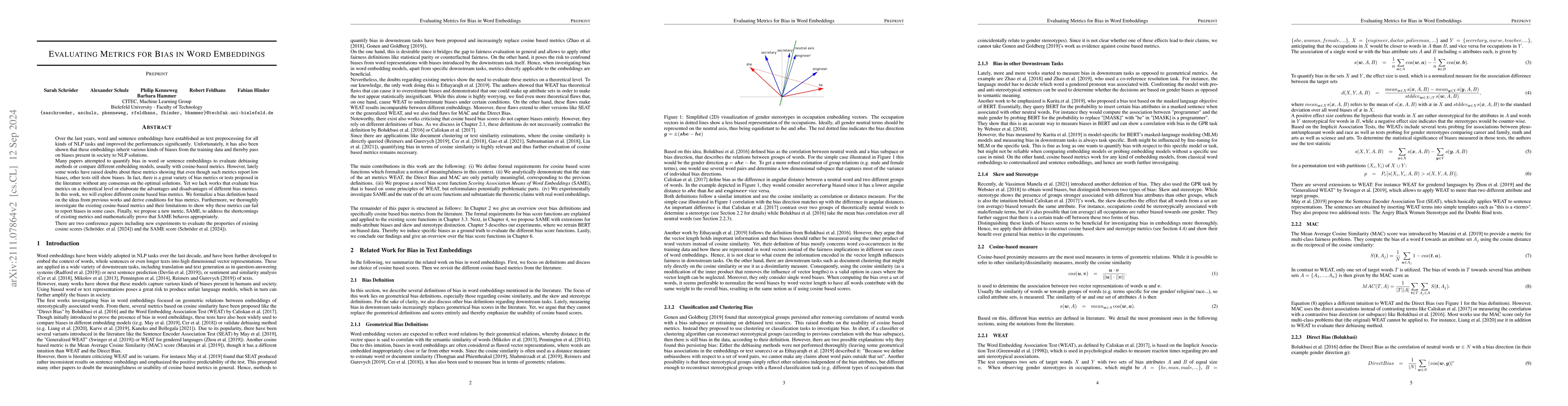 Over the last years, word and sentence embeddings have established as text preprocessing for all kinds of NLP tasks and improved the performances significantly. Unfortunately, it has also been shown that these embeddings inherit various kinds of biases from the training data and thereby pass on biases present in society to NLP solutions. Many papers attempted to quantify bias in word or sentence embeddings to evaluate debiasing methods or compare different embedding models, usually with cosine-based metrics. However, lately some works have raised doubts about these metrics showing that even though such metrics report low biases, other tests still show biases. In fact, there is a great variety of bias metrics or tests proposed in the literature without any consensus on the optimal solutions. Yet we lack works that evaluate bias metrics on a theoretical level or elaborate the advantages and disadvantages of different bias metrics. In this work, we will explore different cosine based bias metrics. We formalize a bias definition based on the ideas from previous works and derive conditions for bias metrics. Furthermore, we thoroughly investigate the existing cosine-based metrics and their limitations to show why these metrics can fail to report biases in some cases. Finally, we propose a new metric, SAME, to address the shortcomings of existing metrics and mathematically prove that SAME behaves appropriately.