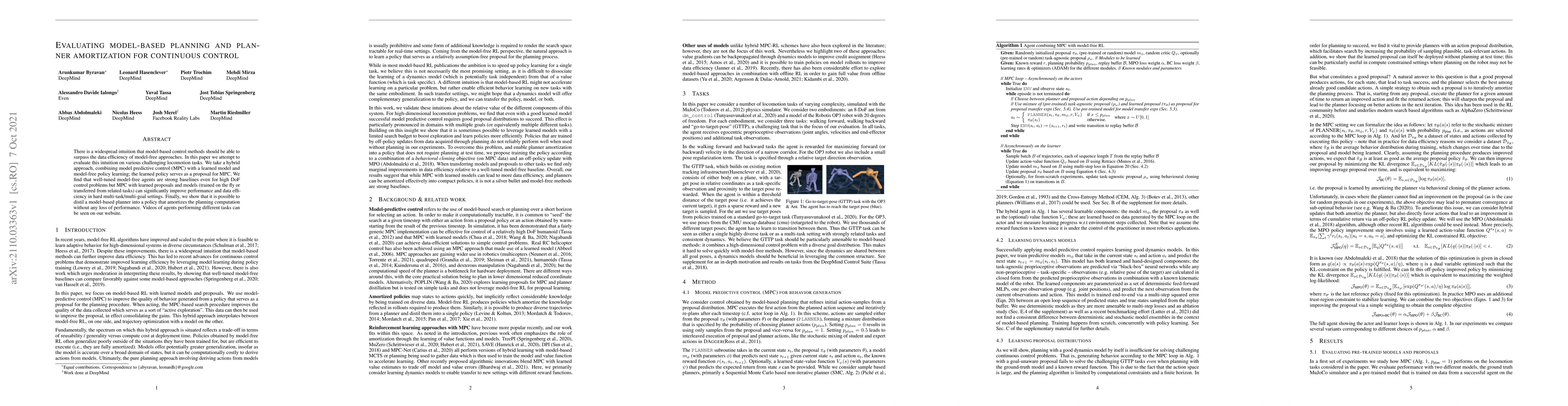 There is a widespread intuition that model-based control methods should be able to surpass the data efficiency of model-free approaches. In this paper we attempt to evaluate this intuition on various challenging locomotion tasks. We take a hybrid approach, combining model predictive control (MPC) with a learned model and model-free policy learning; the learned policy serves as a proposal for MPC. We find that well-tuned model-free agents are strong baselines even for high DoF control problems but MPC with learned proposals and models (trained on the fly or transferred from related tasks) can significantly improve performance and data efficiency in hard multi-task/multi-goal settings. Finally, we show that it is possible to distil a model-based planner into a policy that amortizes the planning computation without any loss of performance. Videos of agents performing different tasks can be seen at https://sites.google.com/view/mbrl-amortization/home.