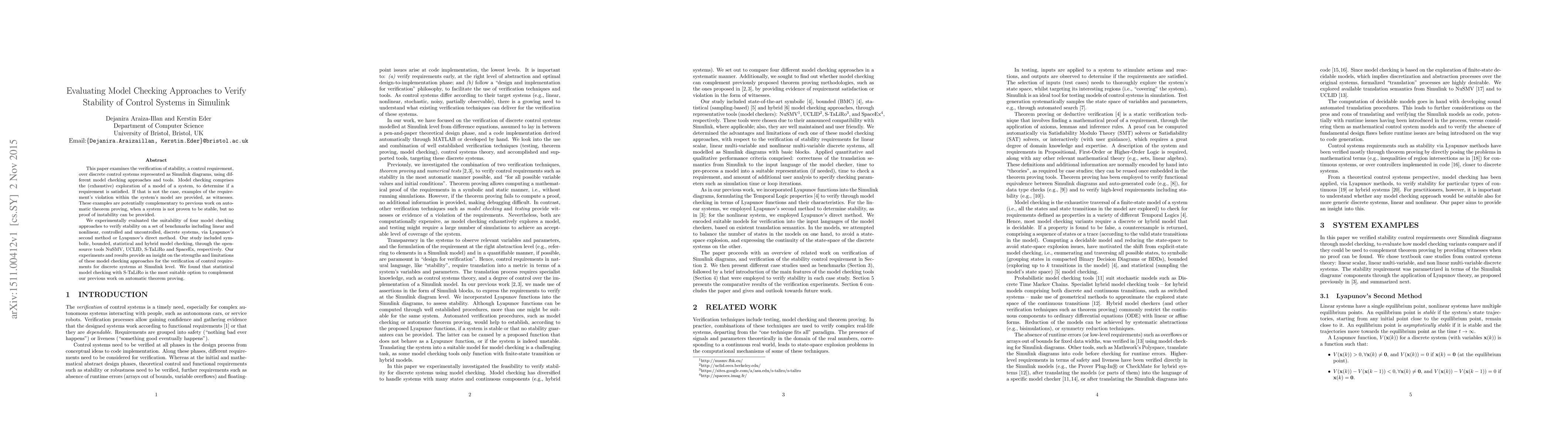 This paper evaluates the effectiveness of four model checking approaches—symbolic, bounded, statistical, and hybrid—to verify stability in Simulink-based control systems. Statistical model checking with S-TaLiRo emerged as the most suitable method, offering valuable insights into the verification of control requirements.