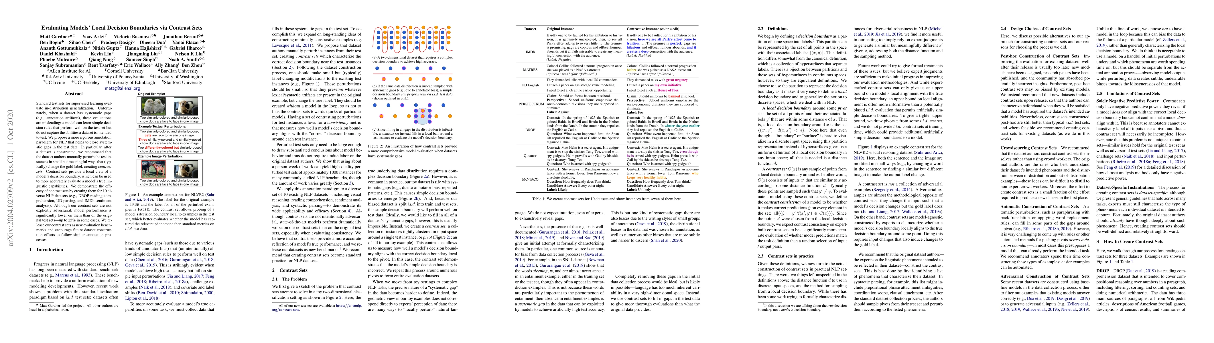 Standard test sets for supervised learning evaluate in-distribution generalization. Unfortunately, when a dataset has systematic gaps (e.g., annotation artifacts), these evaluations are misleading: a model can learn simple decision rules that perform well on the test set but do not capture a dataset's intended capabilities. We propose a new annotation paradigm for NLP that helps to close systematic gaps in the test data. In particular, after a dataset is constructed, we recommend that the dataset authors manually perturb the test instances in small but meaningful ways that (typically) change the gold label, creating contrast sets. Contrast sets provide a local view of a model's decision boundary, which can be used to more accurately evaluate a model's true linguistic capabilities. We demonstrate the efficacy of contrast sets by creating them for 10 diverse NLP datasets (e.g., DROP reading comprehension, UD parsing, IMDb sentiment analysis). Although our contrast sets are not explicitly adversarial, model performance is significantly lower on them than on the original test sets---up to 25\% in some cases. We release our contrast sets as new evaluation benchmarks and encourage future dataset construction efforts to follow similar annotation processes.