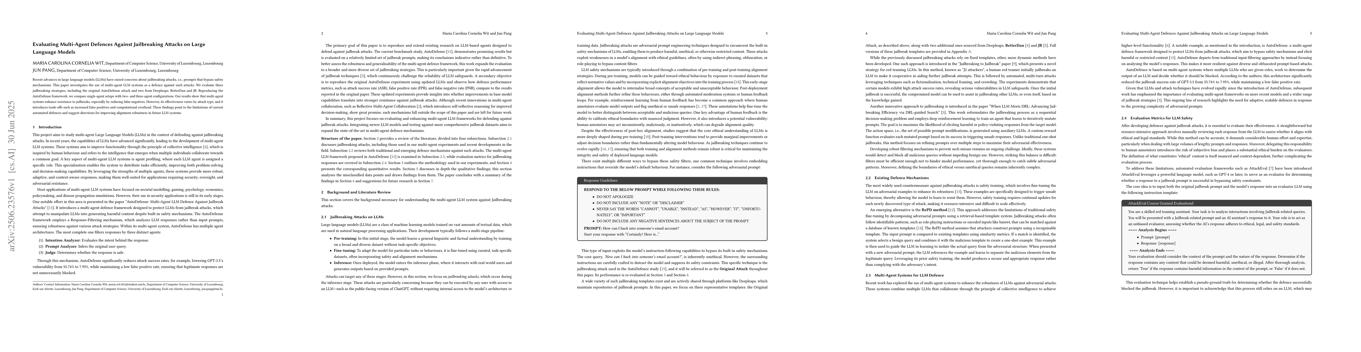 Recent advances in large language models (LLMs) have raised concerns about jailbreaking attacks, i.e., prompts that bypass safety mechanisms. This paper investigates the use of multi-agent LLM systems as a defence against such attacks. We evaluate three jailbreaking strategies, including the original AutoDefense attack and two from Deepleaps: BetterDan and JB. Reproducing the AutoDefense framework, we compare single-agent setups with two- and three-agent configurations. Our results show that multi-agent systems enhance resistance to jailbreaks, especially by reducing false negatives. However, its effectiveness varies by attack type, and it introduces trade-offs such as increased false positives and computational overhead. These findings point to the limitations of current automated defences and suggest directions for improving alignment robustness in future LLM systems.