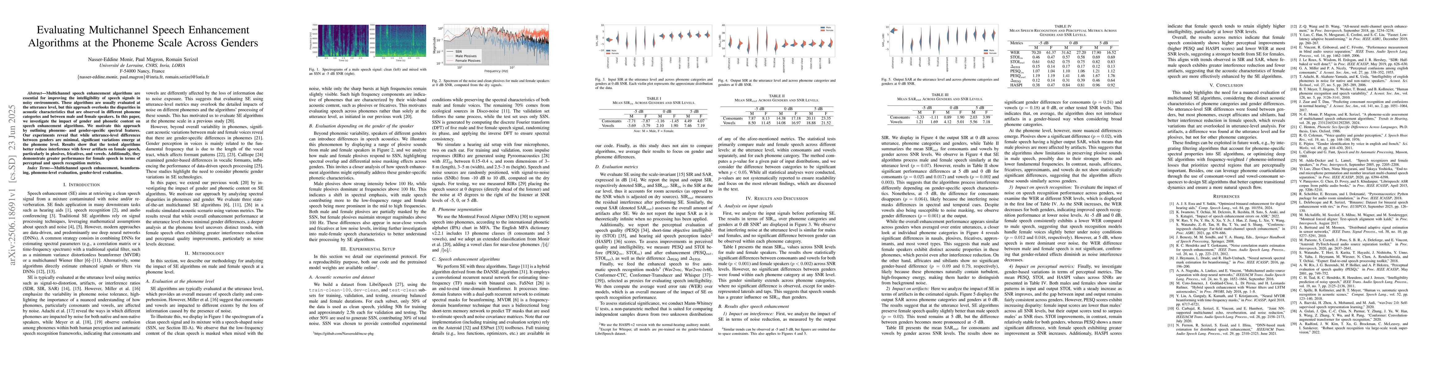 This research examines the effectiveness of multichannel speech enhancement algorithms for male and female speakers at the phoneme scale, revealing significant variations in performance, especially in reducing interference and generating artifacts for female speech in plosives, fricatives, and vowels. The study underscores the need for phoneme- and gender-specific evaluations of these algorithms.