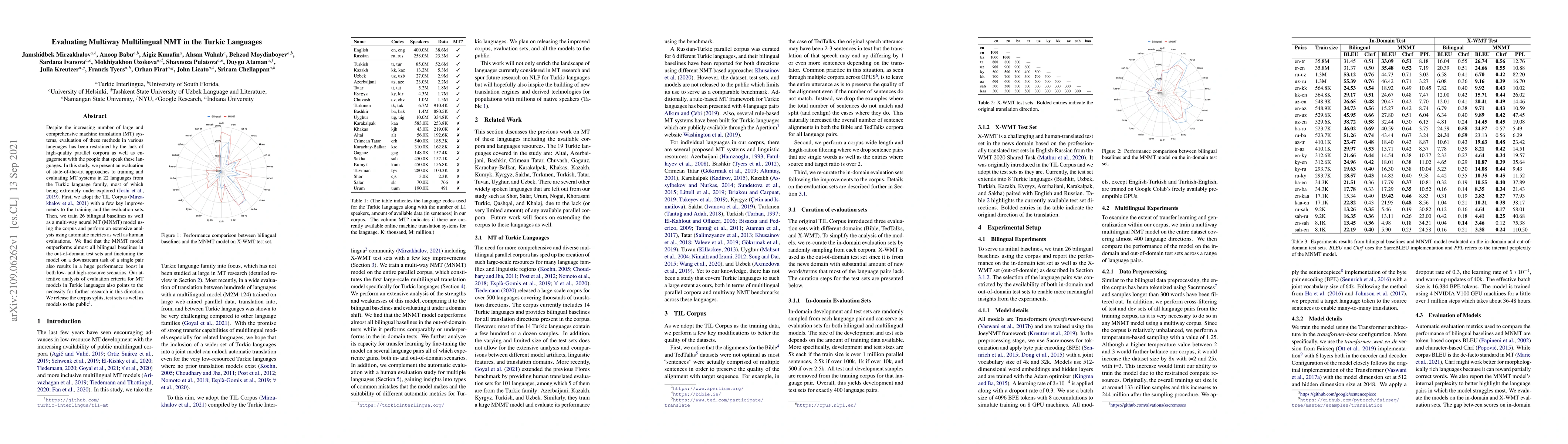 Despite the increasing number of large and comprehensive machine translation (MT) systems, evaluation of these methods in various languages has been restrained by the lack of high-quality parallel corpora as well as engagement with the people that speak these languages. In this study, we present an evaluation of state-of-the-art approaches to training and evaluating MT systems in 22 languages from the Turkic language family, most of which being extremely under-explored. First, we adopt the TIL Corpus with a few key improvements to the training and the evaluation sets. Then, we train 26 bilingual baselines as well as a multi-way neural MT (MNMT) model using the corpus and perform an extensive analysis using automatic metrics as well as human evaluations. We find that the MNMT model outperforms almost all bilingual baselines in the out-of-domain test sets and finetuning the model on a downstream task of a single pair also results in a huge performance boost in both low- and high-resource scenarios. Our attentive analysis of evaluation criteria for MT models in Turkic languages also points to the necessity for further research in this direction. We release the corpus splits, test sets as well as models to the public.