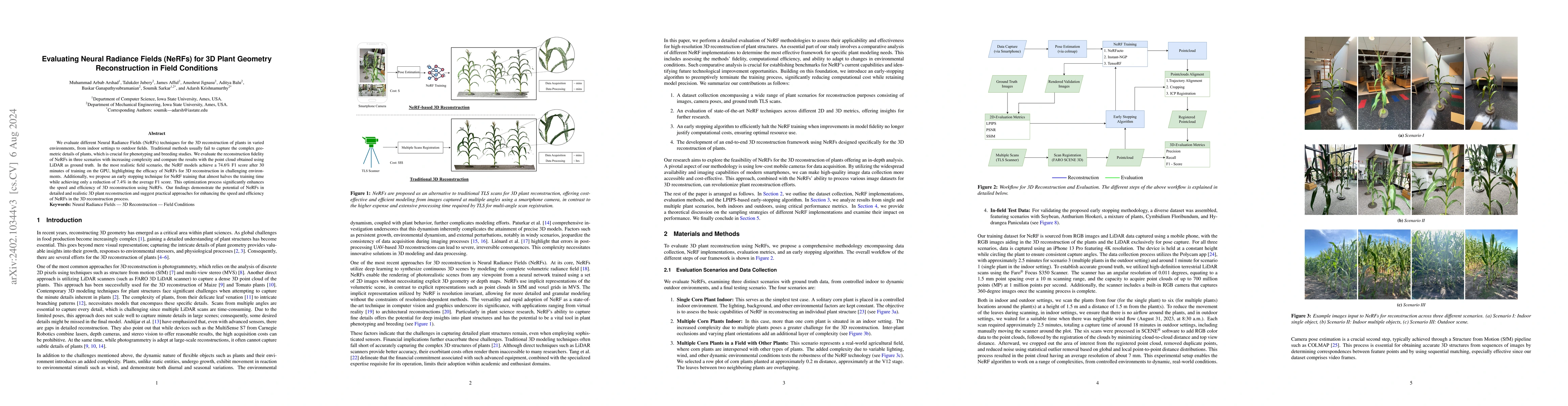 This study evaluates Neural Radiance Fields (NeRFs) for reconstructing 3D plant geometry in diverse environments, comparing their performance against LiDAR point clouds. The NeRF models achieve a 74.65% F1 score in realistic field conditions, showcasing their efficiency and accuracy for detailed 3D plant modeling.