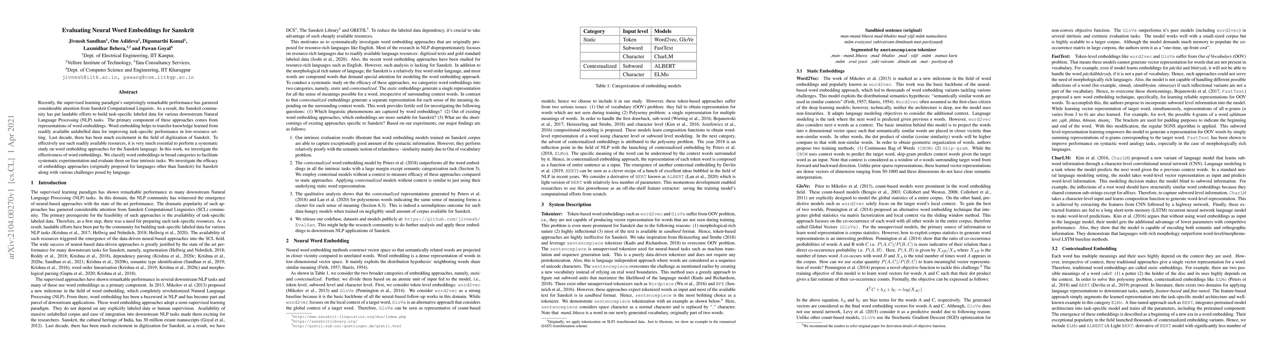 Recently, the supervised learning paradigm's surprisingly remarkable performance has garnered considerable attention from Sanskrit Computational Linguists. As a result, the Sanskrit community has put laudable efforts to build task-specific labeled data for various downstream Natural Language Processing (NLP) tasks. The primary component of these approaches comes from representations of word embeddings. Word embedding helps to transfer knowledge learned from readily available unlabelled data for improving task-specific performance in low-resource setting. Last decade, there has been much excitement in the field of digitization of Sanskrit. To effectively use such readily available resources, it is very much essential to perform a systematic study on word embedding approaches for the Sanskrit language. In this work, we investigate the effectiveness of word embeddings. We classify word embeddings in broad categories to facilitate systematic experimentation and evaluate them on four intrinsic tasks. We investigate the efficacy of embeddings approaches (originally proposed for languages other than Sanskrit) for Sanskrit along with various challenges posed by language.